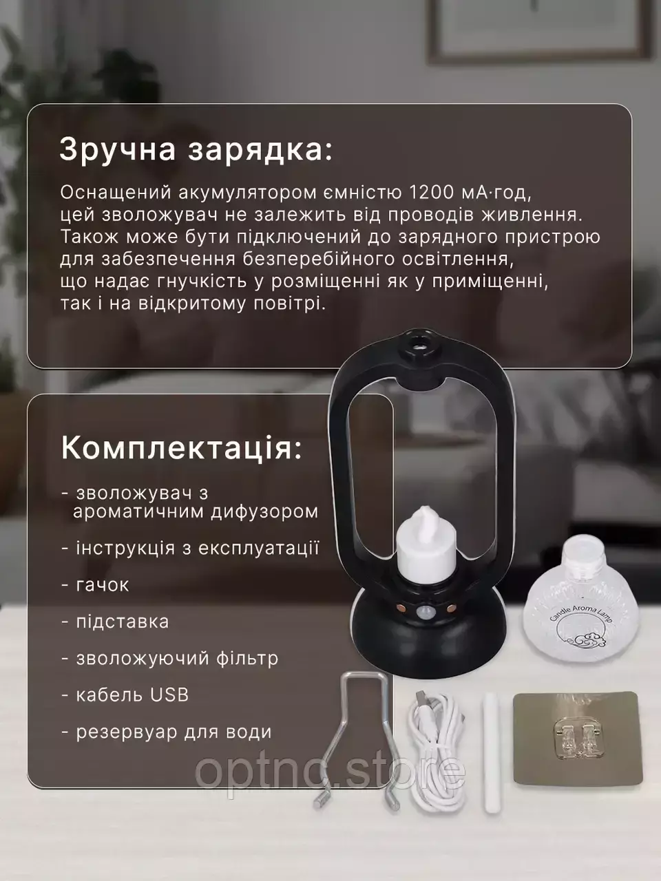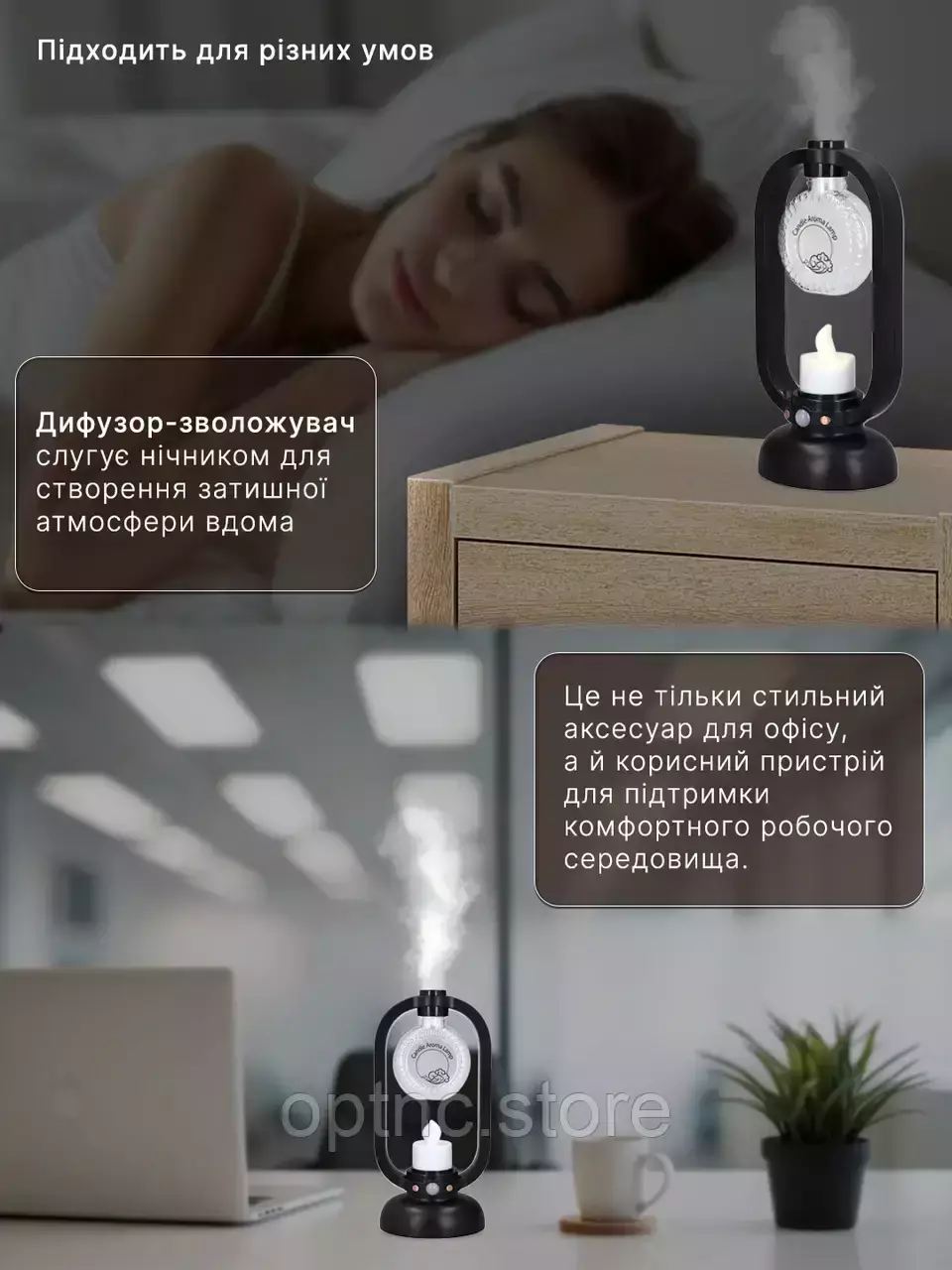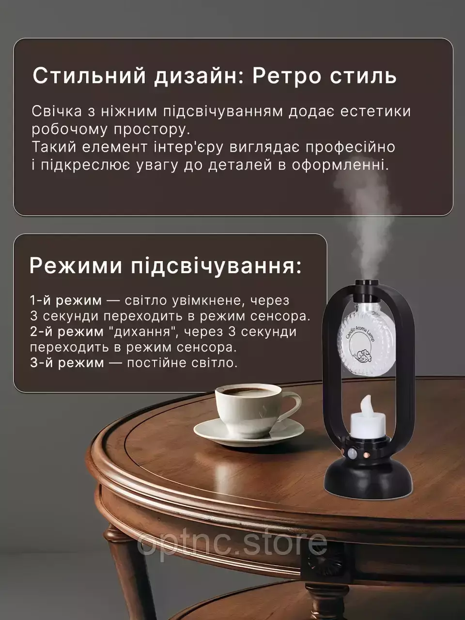 - Эстетика и стиль: аромадиффузор, стилизованный под ретро-лампу, станет элегантным акцентом вашего интерьера. Едва заметная имитация горящей свечи добавит волшебства в любое мгновение – будь то вечер с книгой или романтический ужин.