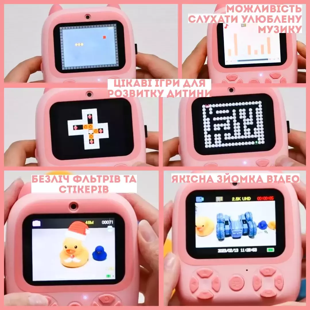 - Печать: Мгновенная печать черно-белых фото на термобумаге, которые дети могут разукрашивать фломастерами.