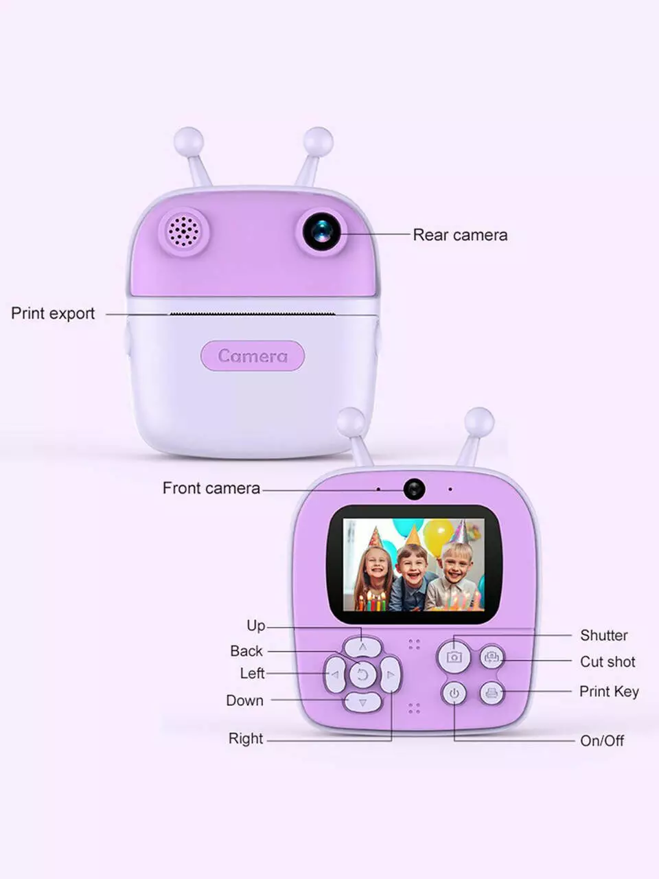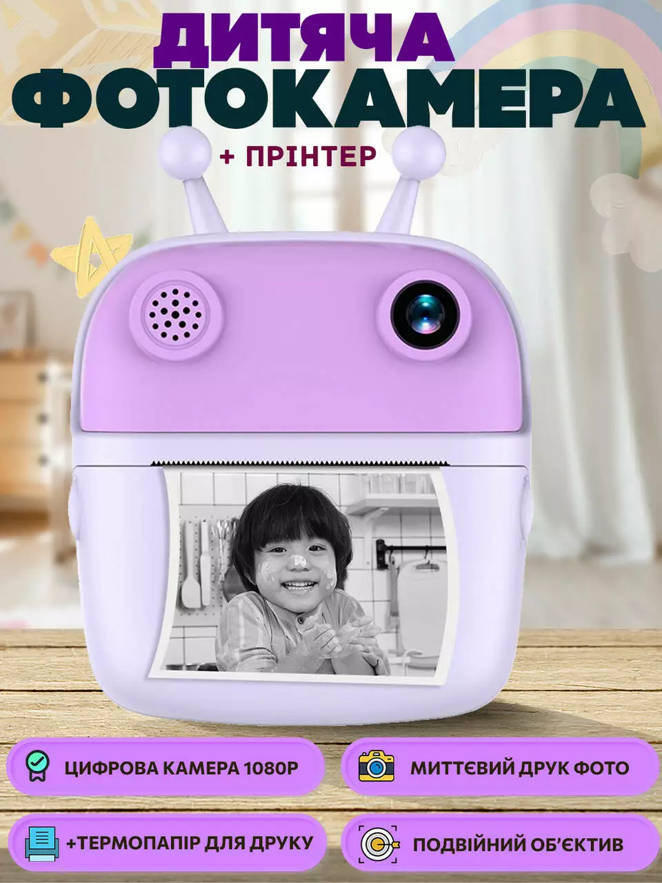 Детский мини фотоаппарат 2,4 дюйма + 2 рулона бумаги с моментальной печатью питание от USB Фиолетовій