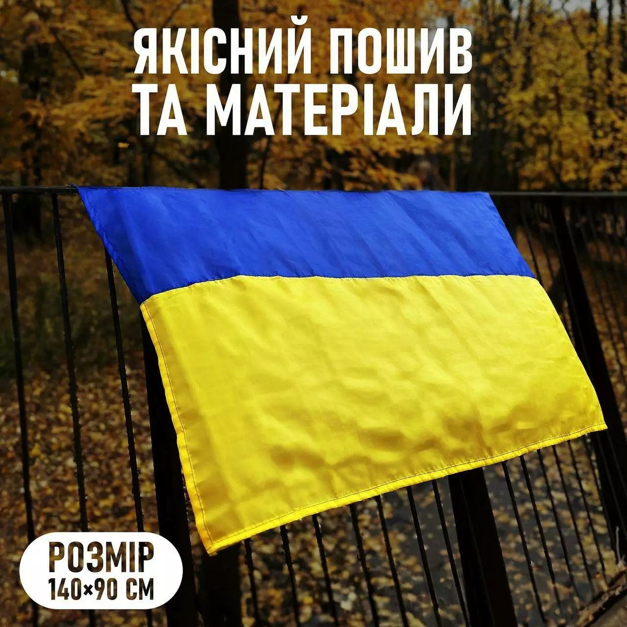 Государственный Флаг Украины воспроизведен точно по стандартам в размере 140 × 90 см. Его присутствие придает изделию официальный статус и торжественность.