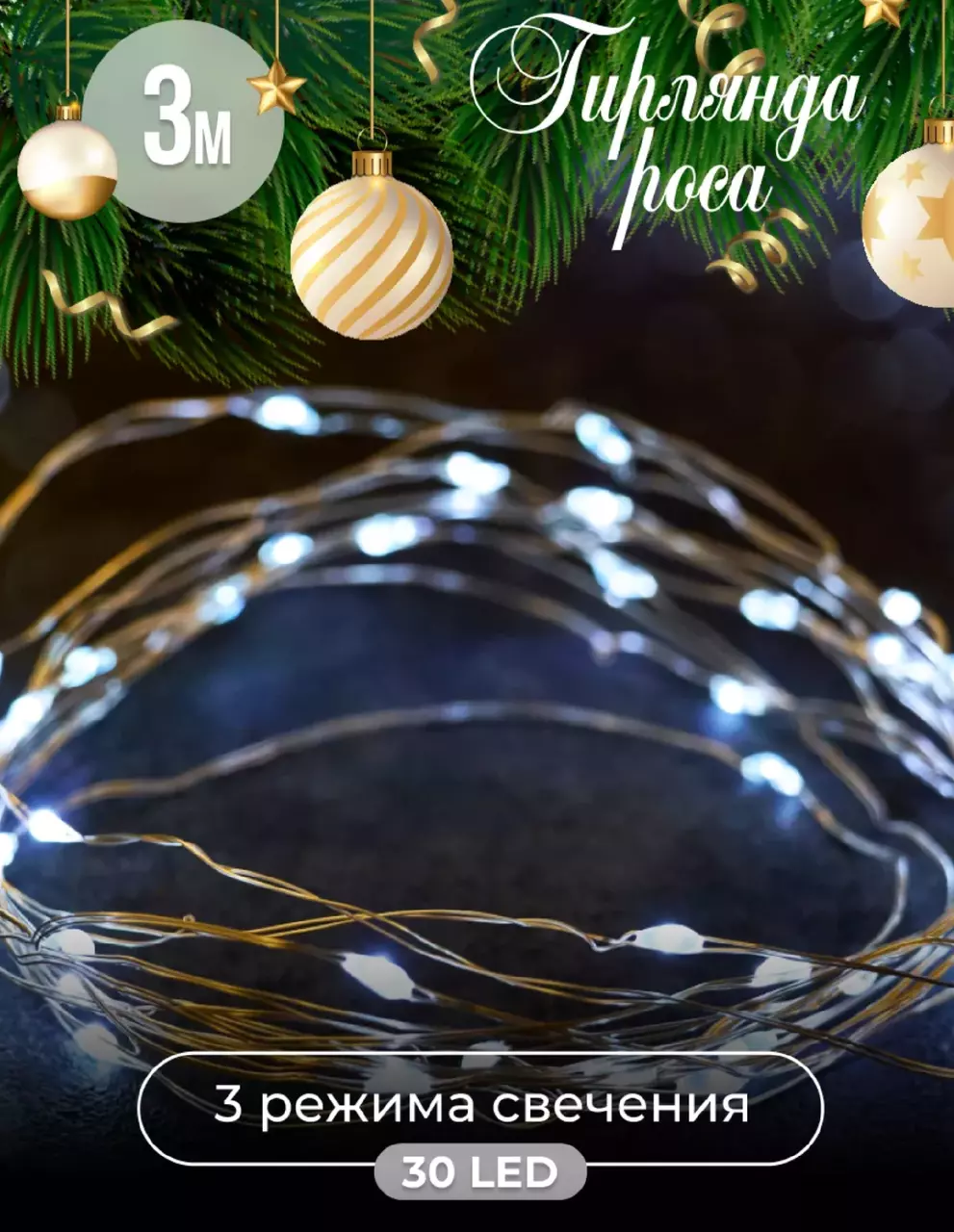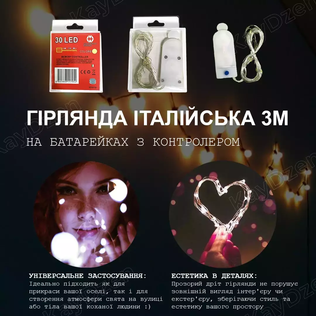Гирлянда итальянская "РОССА" 30 LED ламп 3 метра на батарейках с умным контроллером и тремя режимами света