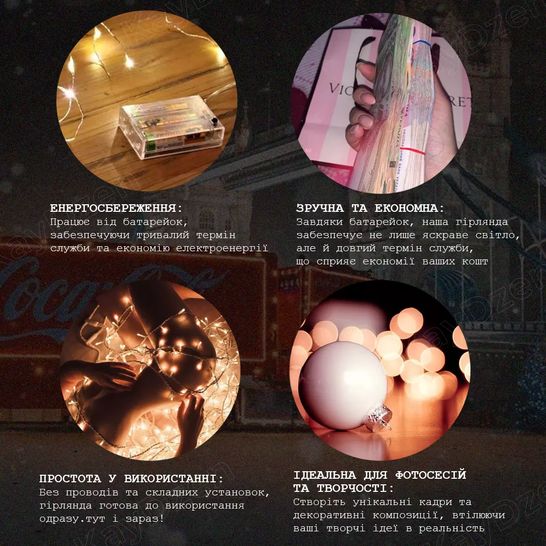 Экономия денег: Благодаря эффективному использованию батареек, наша LED-гирлянда обеспечивает не только яркий свет, но и долгий срок службы, что способствует экономии ваших средств