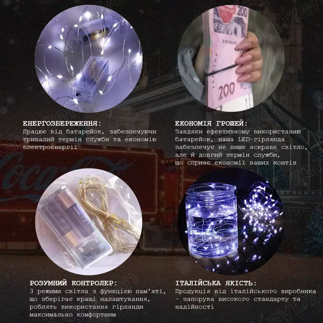 - Экономия денег: Благодаря эффективному использованию батареек, наша LED-гирлянда обеспечивает не только яркий свет, но и долгий срок службы, что способствует экономии ваших средств