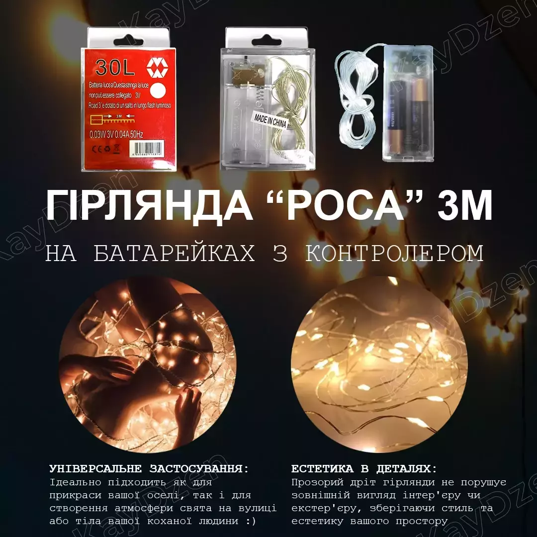 Гирлянда "РОССА" 30 LED ламп 3m на батарейках с умным контроллером и тремя режимами света (тёплый жёлтый)