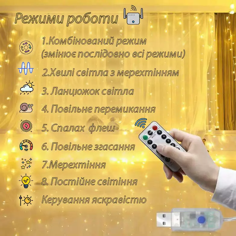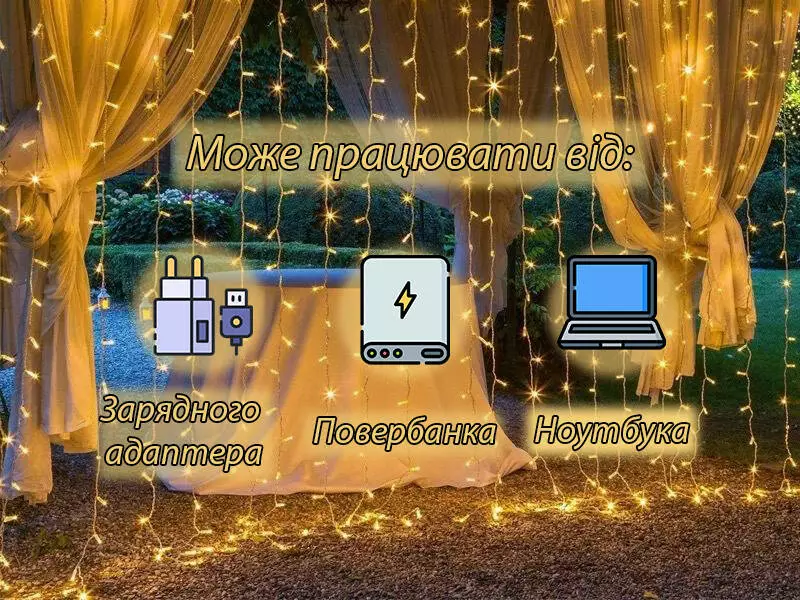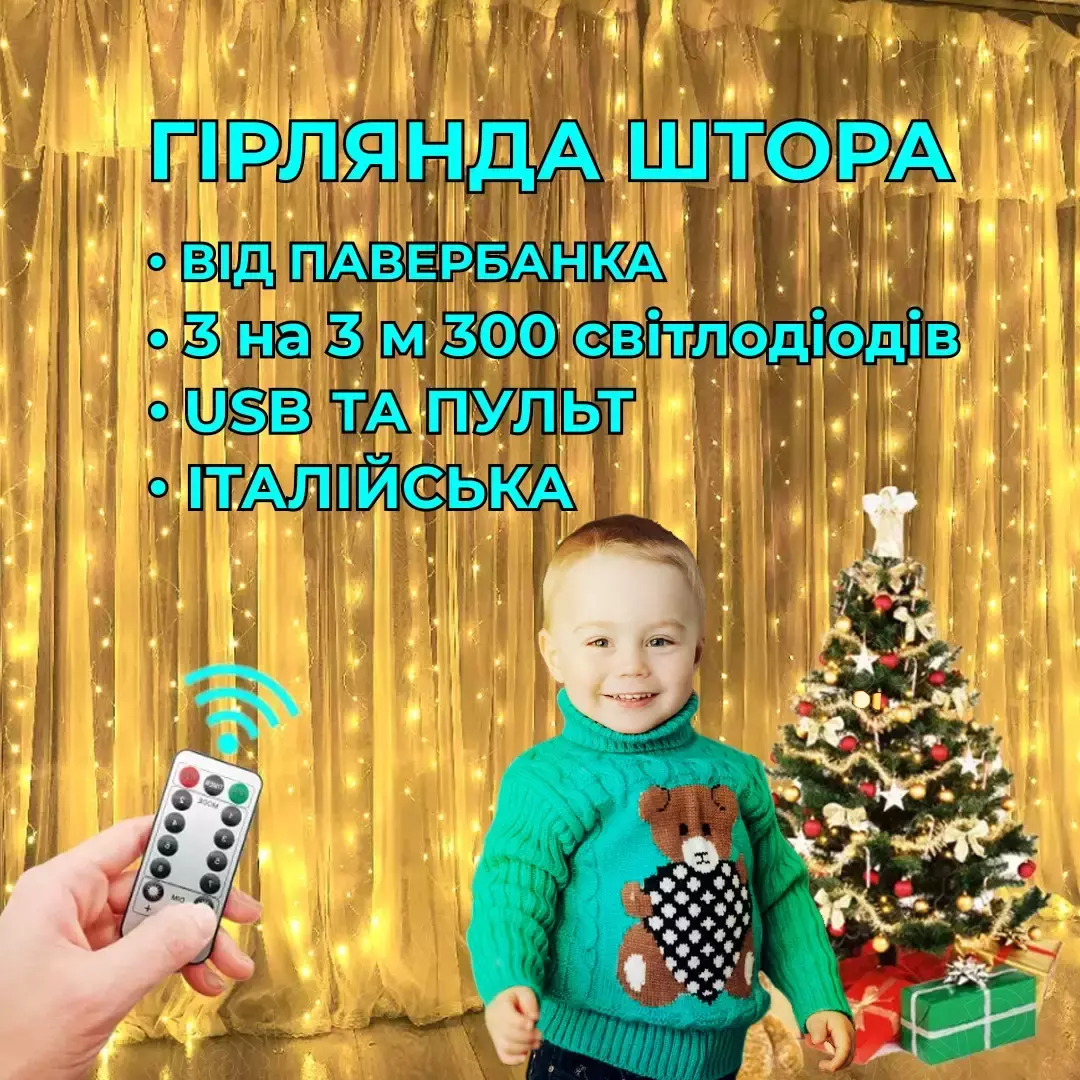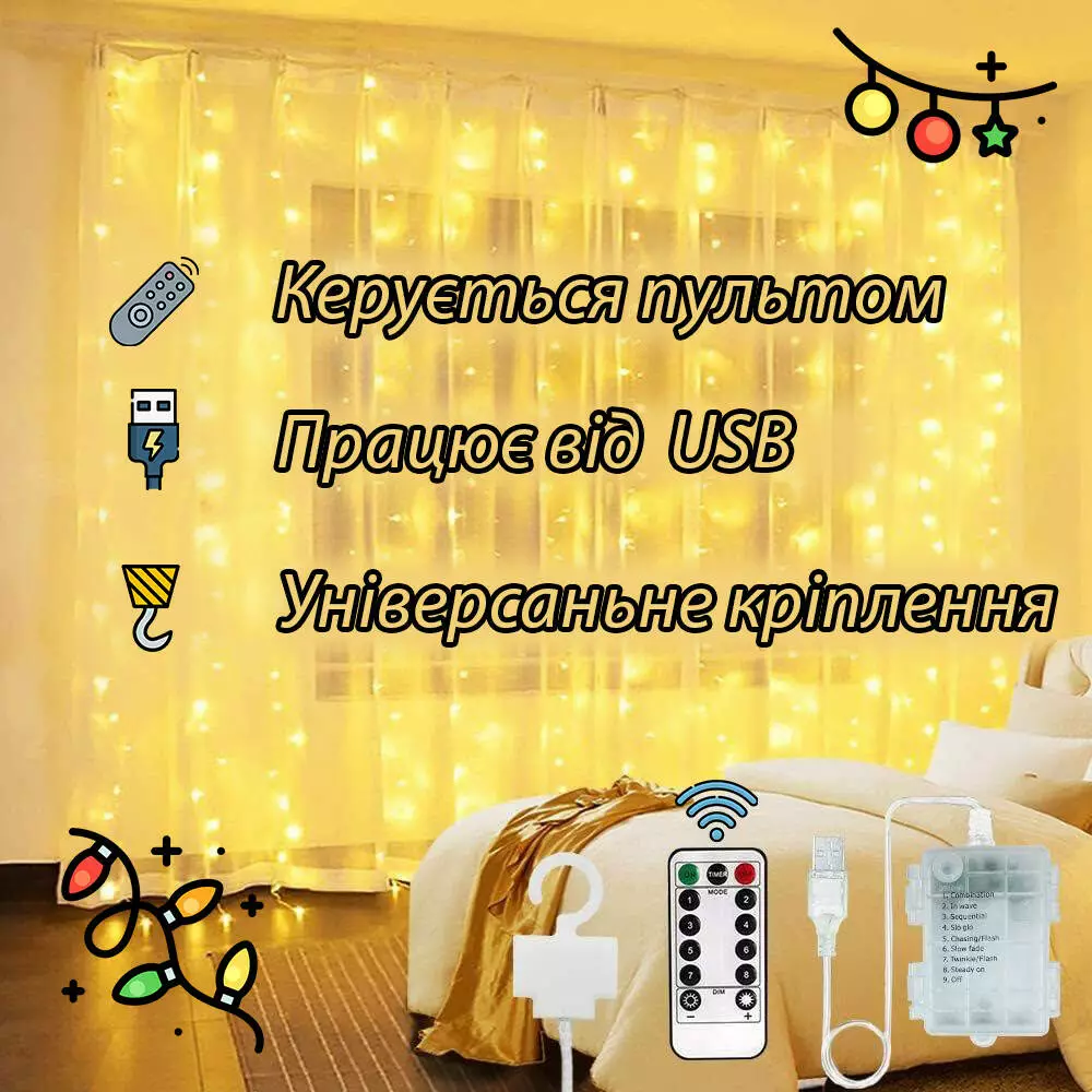 Гирлянда Штора LED Foyu FO-F01 от павербанка 3 на 3 метра USB с пультом (тёплый жёлтый цвет)