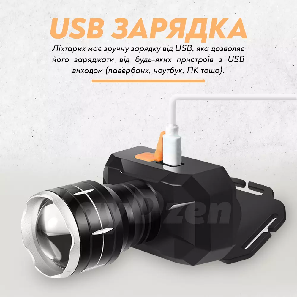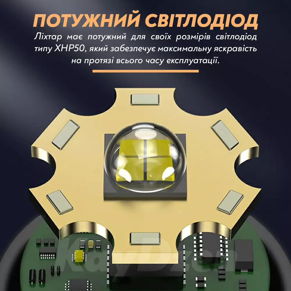 - Яскравий та надійний світлодіод Р50: Забезпечує чітке та комфортне освітлення у чотирьох режимах роботи
