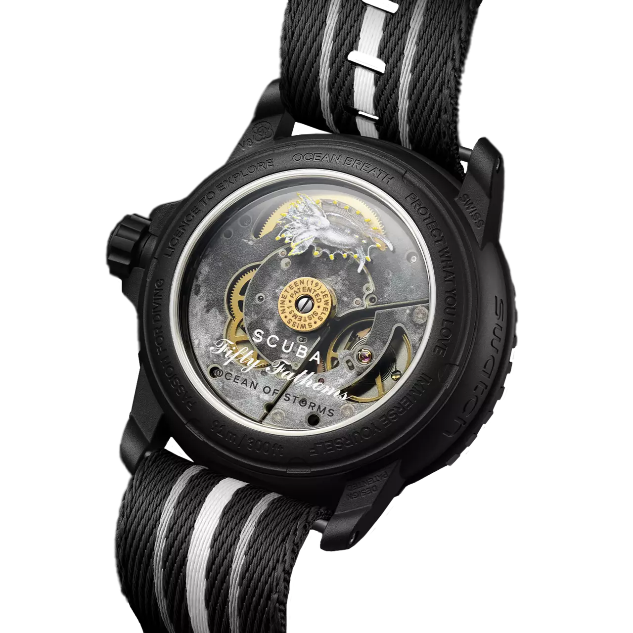 Эти часы олицетворяют собой мощь океана и дух исследований, что подчеркивается изображением региона Луны Oceanus Procellarum и голожаберным телом Okenia Luna на прозрачной задней крышке, через которую виден механизм SISTEM51. Все часы коллекции Bioceramic Scuba Fifty Fathoms украшены красочными моллюсками, обитающими в различных океанах мира.