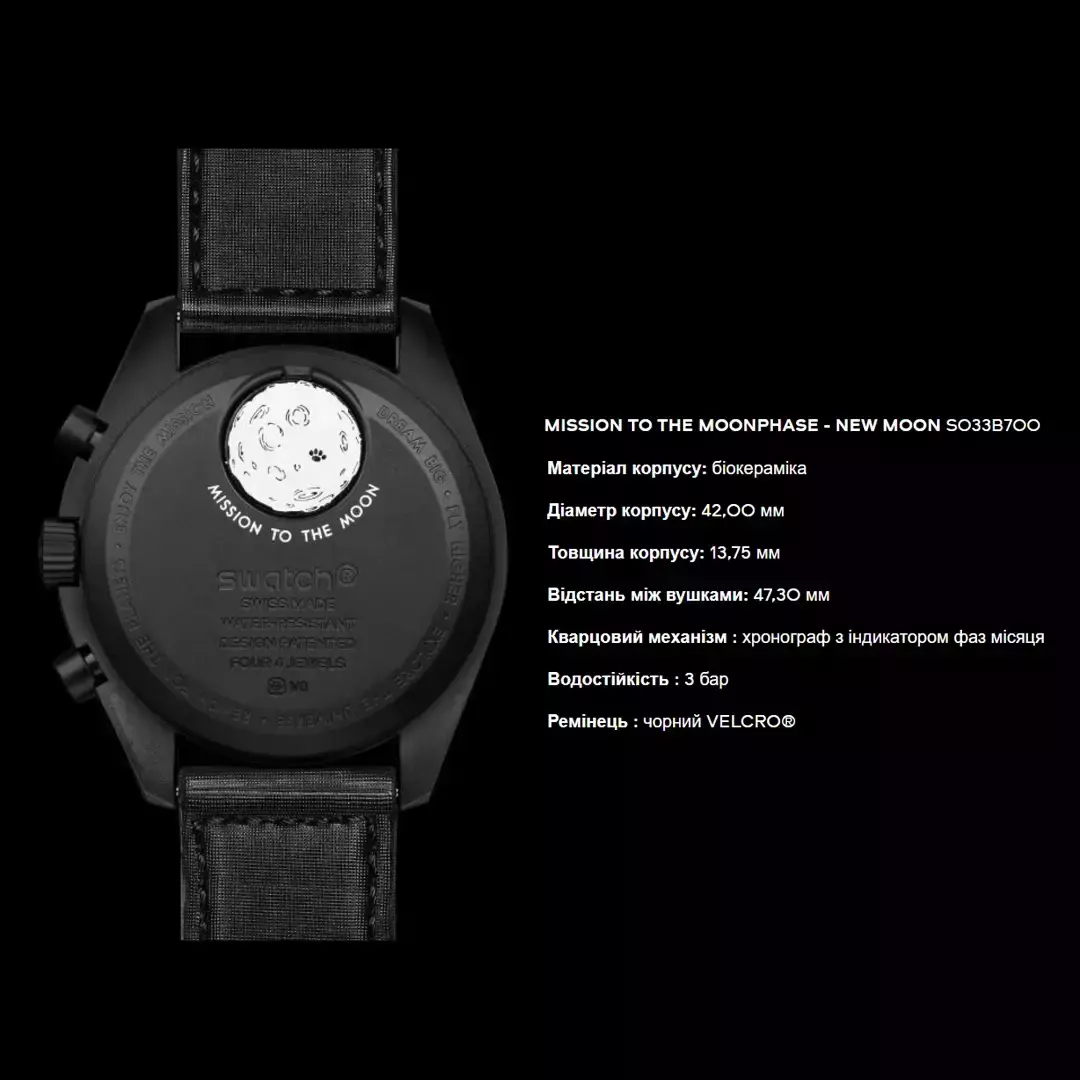 Часы Swatch x Omega Bioceramic MoonSwatch «Mission to the Moonphase — New Moon» — элегантная модель, полностью выполненная в черной цветовой гамме. Эта модель выделяется функцией определения фазы черной луны, возможно, самым поэтичным из всех часовых усложнений. Снупи, который был связан с пилотируемыми космическими полетами с 1960-х годов, изображен лежащим на Луне на диске фаз Луны, который вращается на дополнительном циферблате в положении «2 часа». В ультрафиолетовом свете на уникальном дополнительном циферблате раскрывается скрытая цитата из комикса о Снупи, расположенная среди полумесяцев и звезд.