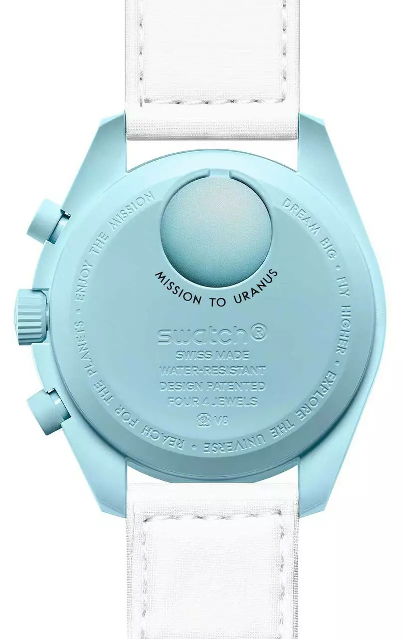 Каждая крышка отсека батареи на задней панели имеет изображение планетарного тела, которое вдохновило на дизайн именно этой модели. Также, на задней крышке каждого BIOCERAMIC MOONSWATCH напечатано текст миссии и встроенная формулировка, которая обязательно вдохновит. "Мечтайте больше - Летите высоко - Исследуйте Вселенную - Достигайте планеты".