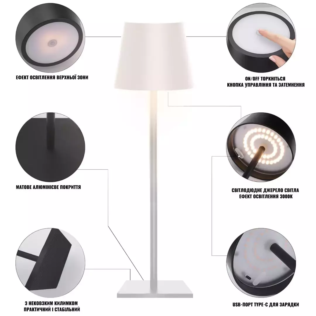 - Подзарядка через USB: Легко заряжайте лампу с помощью USB интерфейса. Входное напряжение: DC5V1A.