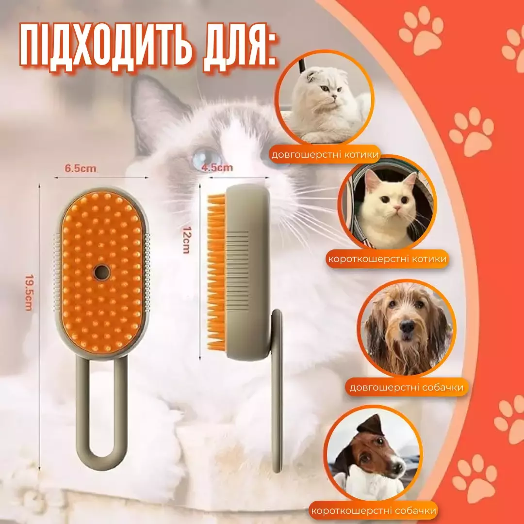 Паровая щетка для кошек и собак — это универсальное устройство 3 в 1, которое сочетает в себе функции расчески, массажера и антистресс-прибора с распылителем. Эта щетка идеально подходит для удаления лишней шерсти, предотвращения образования колтунов и бережного вычесывания подшерстка.