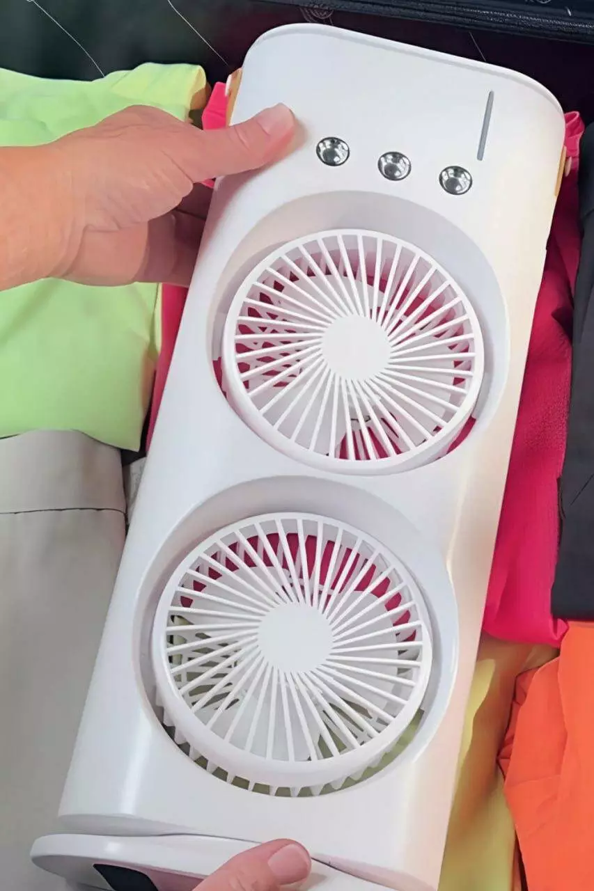 Двойной настольный вентилятор идеально подходит для домашнего использования и украшения вашего дома, офиса. Он не только охлаждает воздух, но и увлажняет его. Дополнительно мини кондиционер оснащен оригинальной подсветкой, которая создаст особый вайб на рабочем месте. Заказав вентилятор с аккумулятором, вы забудете о перебоях с электроэнергией. Батарея гарантирует длительное охлаждение и увлажнение воздуха, из-за чего вы не будете чувствовать сильную жару.