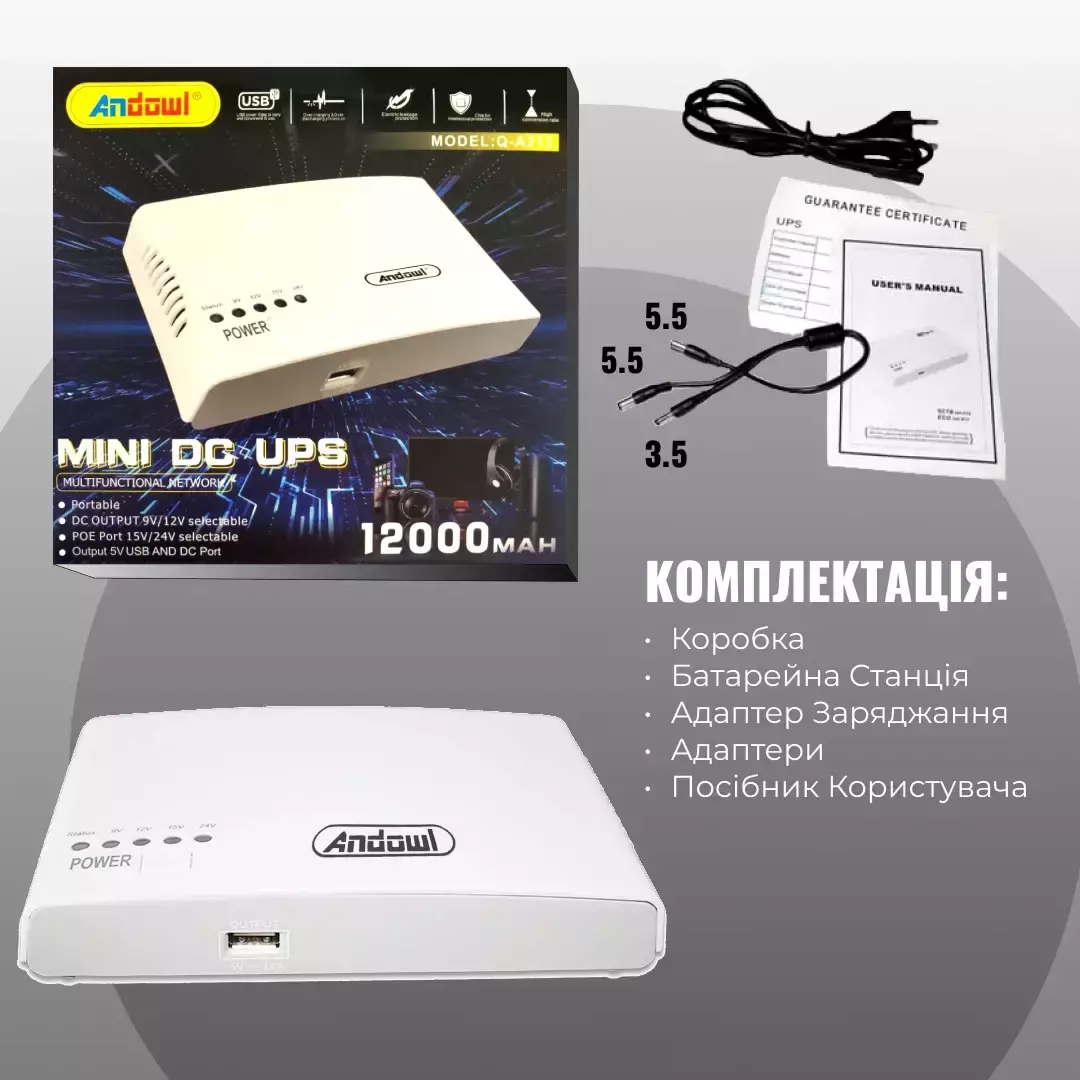 Andowl Q-A212 MINI DC UPS 8800mAh — идеальное решение для резервного питания ваших устройств в случае отключения электроэнергии. Этот мини-ИБП оснащен литиевым аккумулятором емкостью 8800 мАч и поддерживает множество выходных интерфейсов, включая USB, POE и постоянный ток.