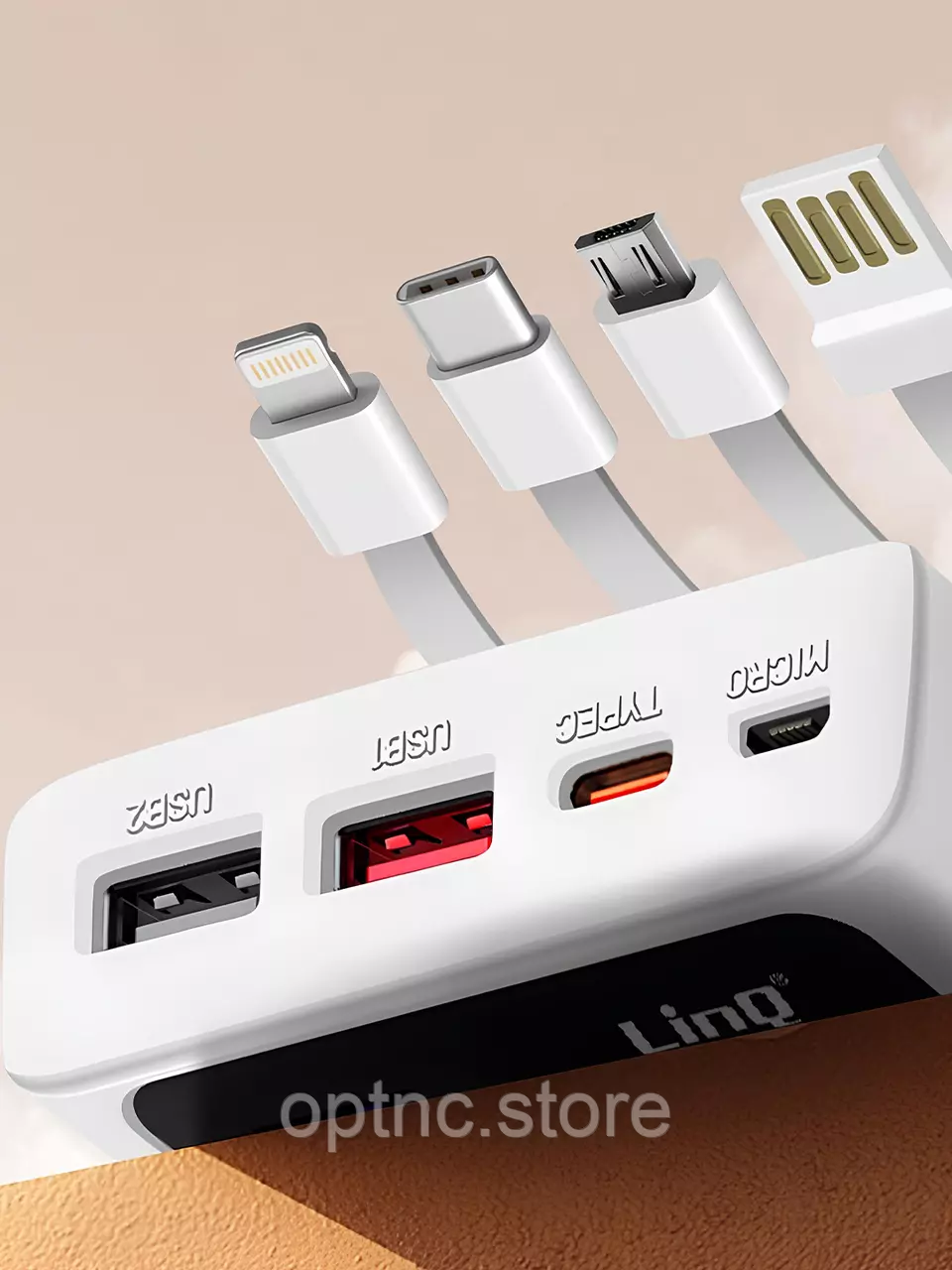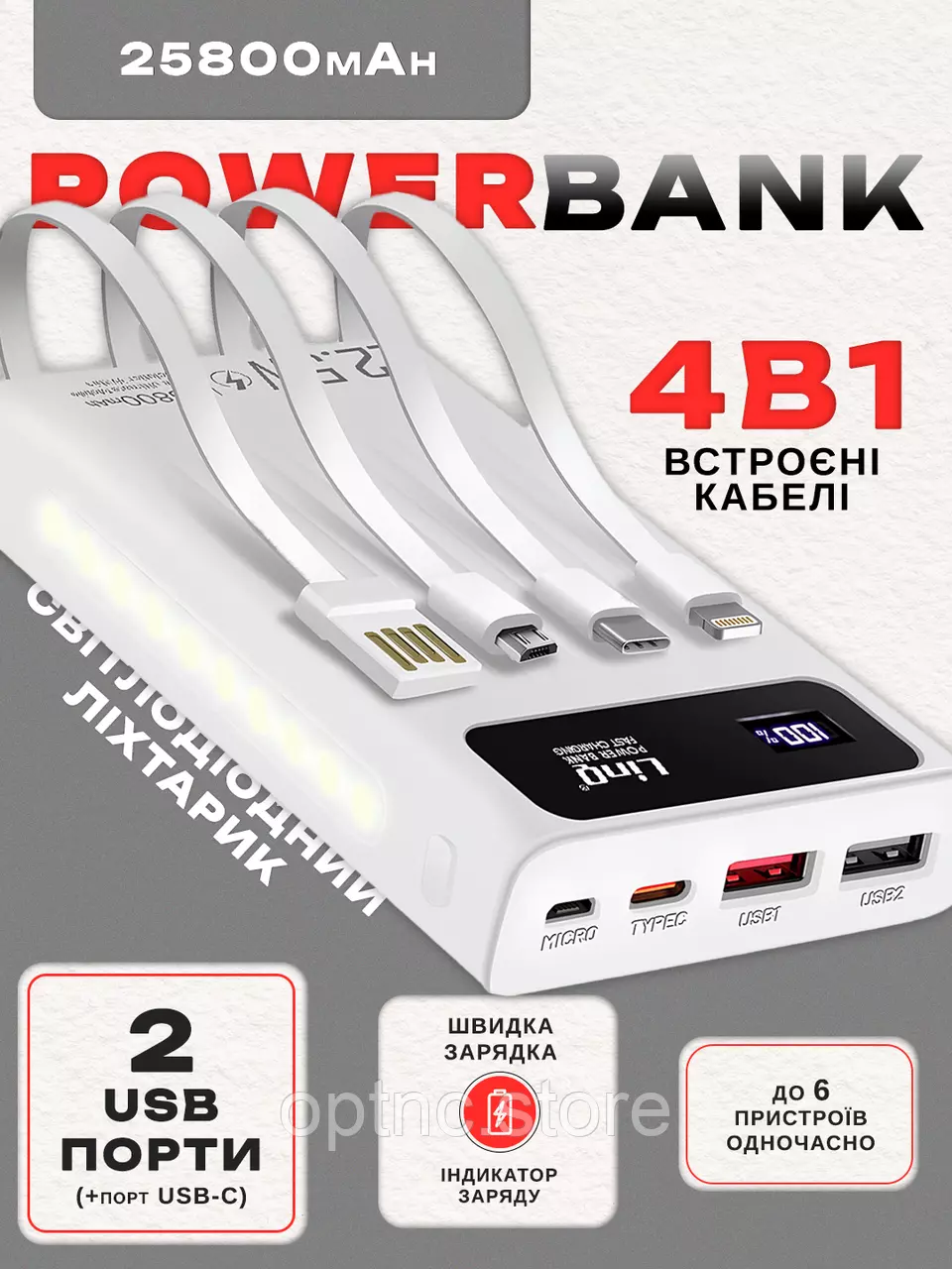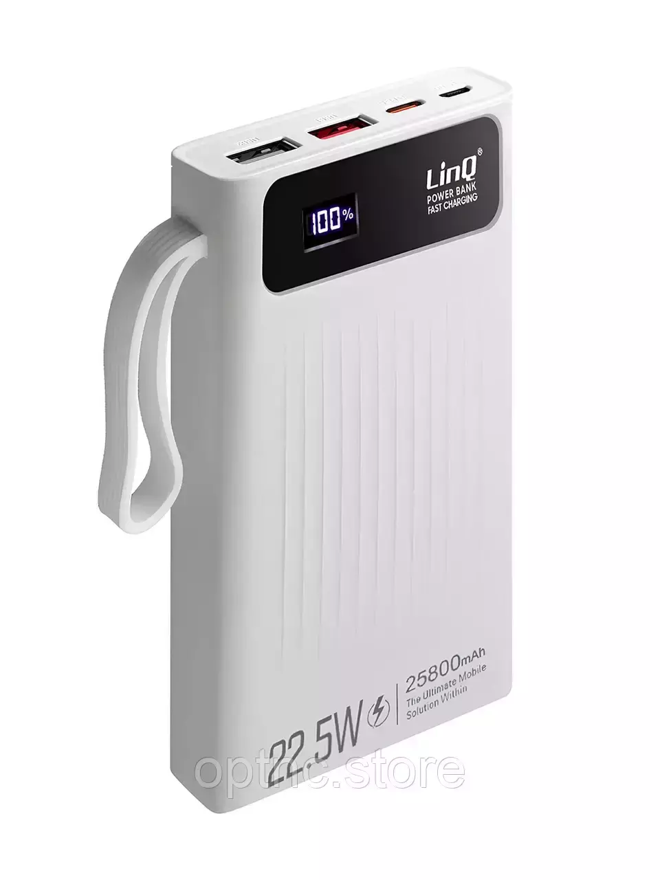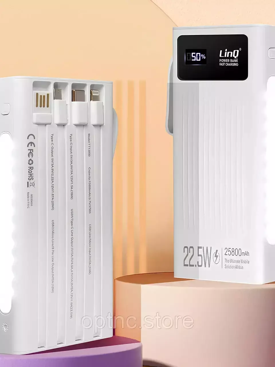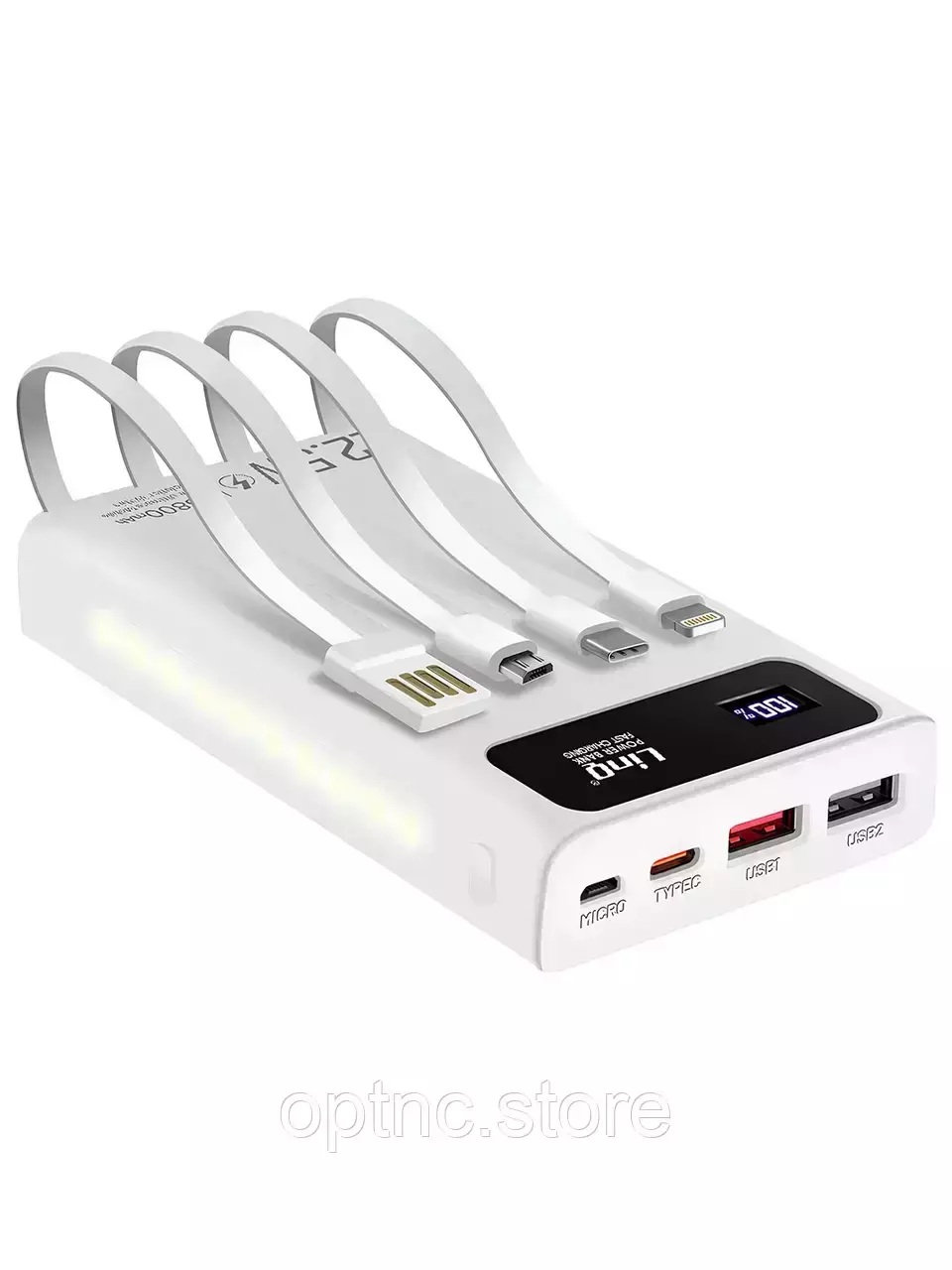 Повербанк с фонариком и дисплеем 25000 mAh 4 кабеля Power Bank LinQ быстрая зарядка (Белый)