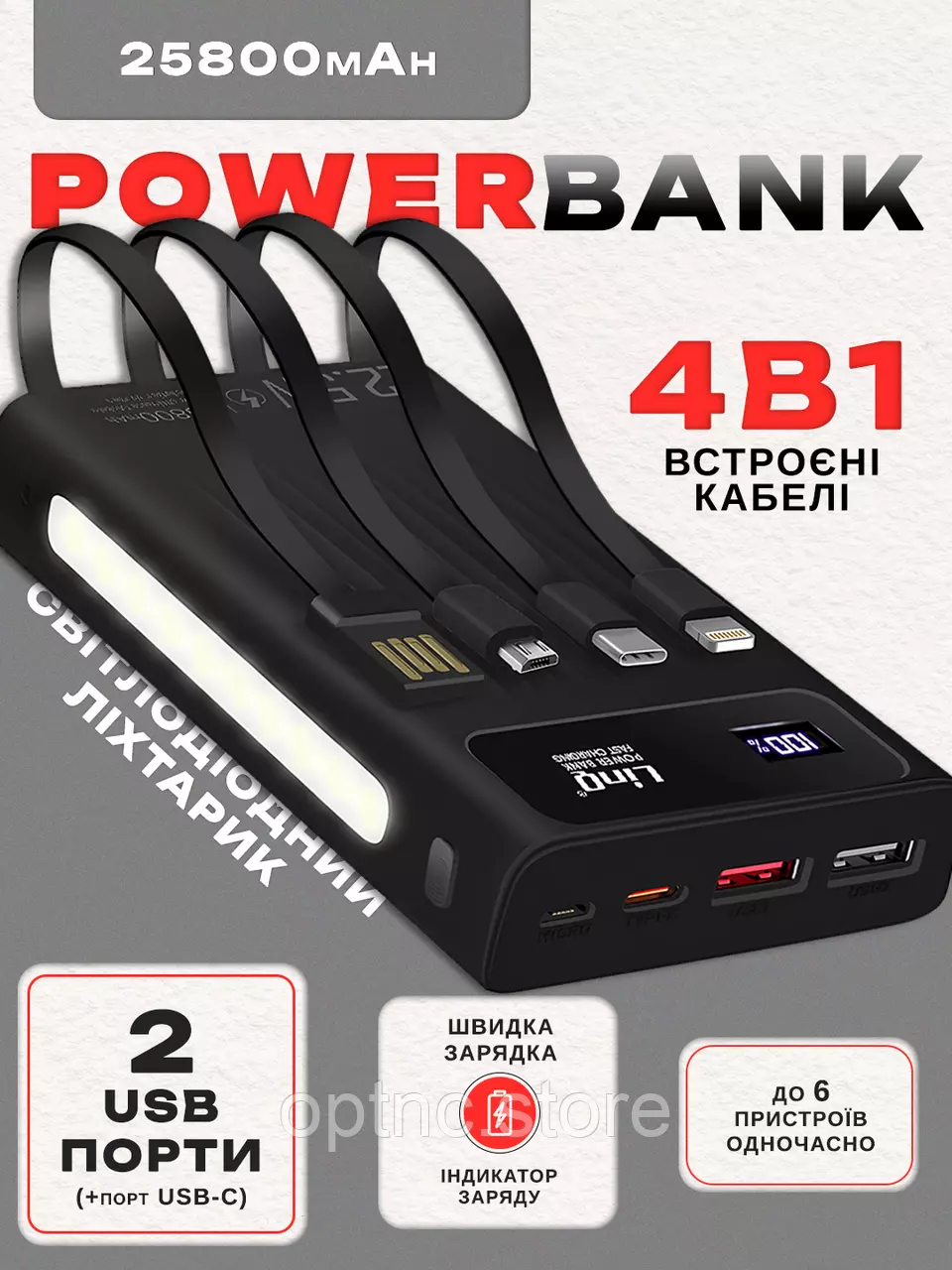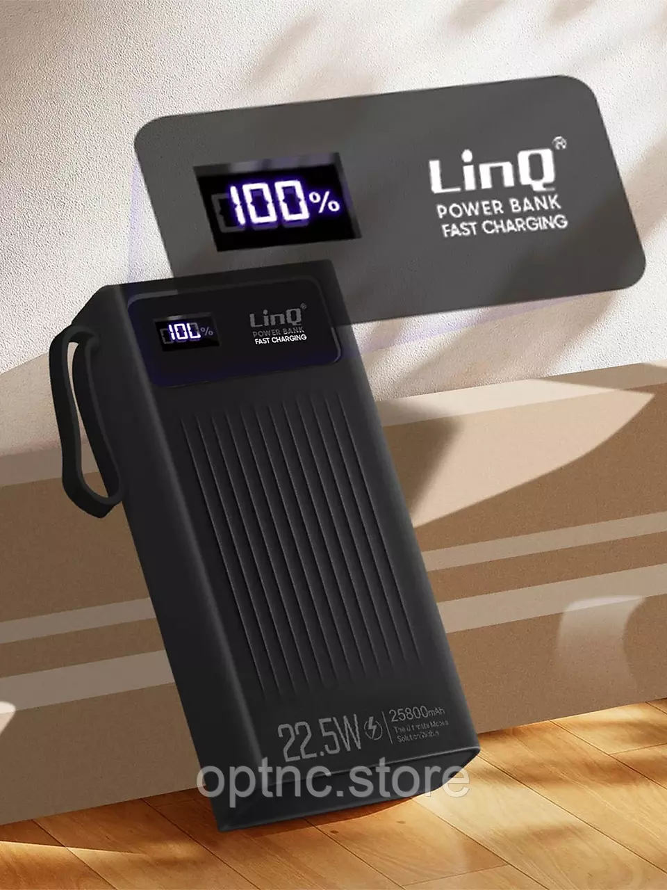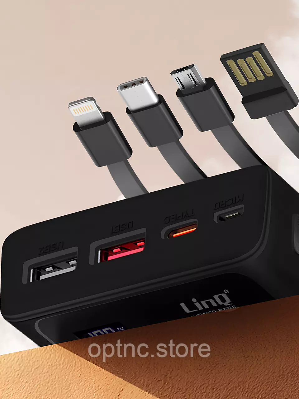 Повербанк с фонариком и дисплеем 25000 mAh 4 кабеля Power Bank LinQ быстрая зарядка (Чёрный)