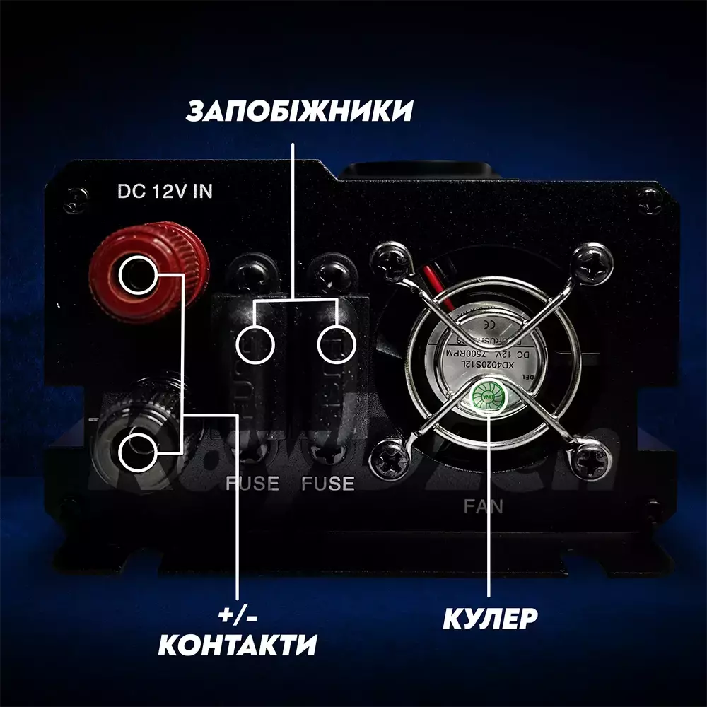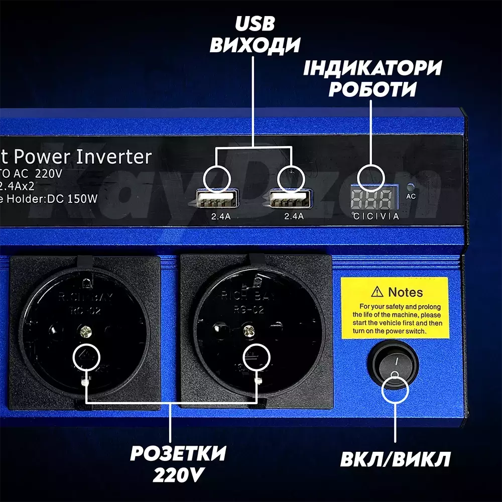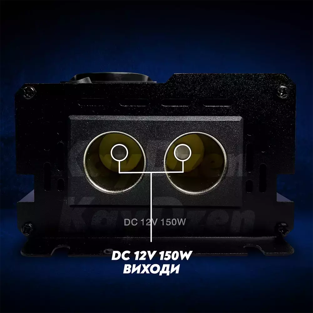 - 2 розетки: Инвертор оснащен двумя розетками, что позволяет подключить больше устройств и гаджетов без использования дополнительных переносок.
