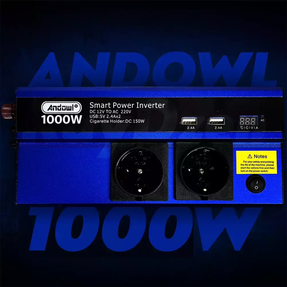 Преобразователь напряжения Andowl QY-7011 1000W — продукт, который позволит вам использовать его в ситуациях и местах, где нет возможности подключения к сети 220 В, но есть возможность подключения к любому источнику питания 12 вольт (автомобильный аккумулятор, лодка, кемпер, солнечные батареи).