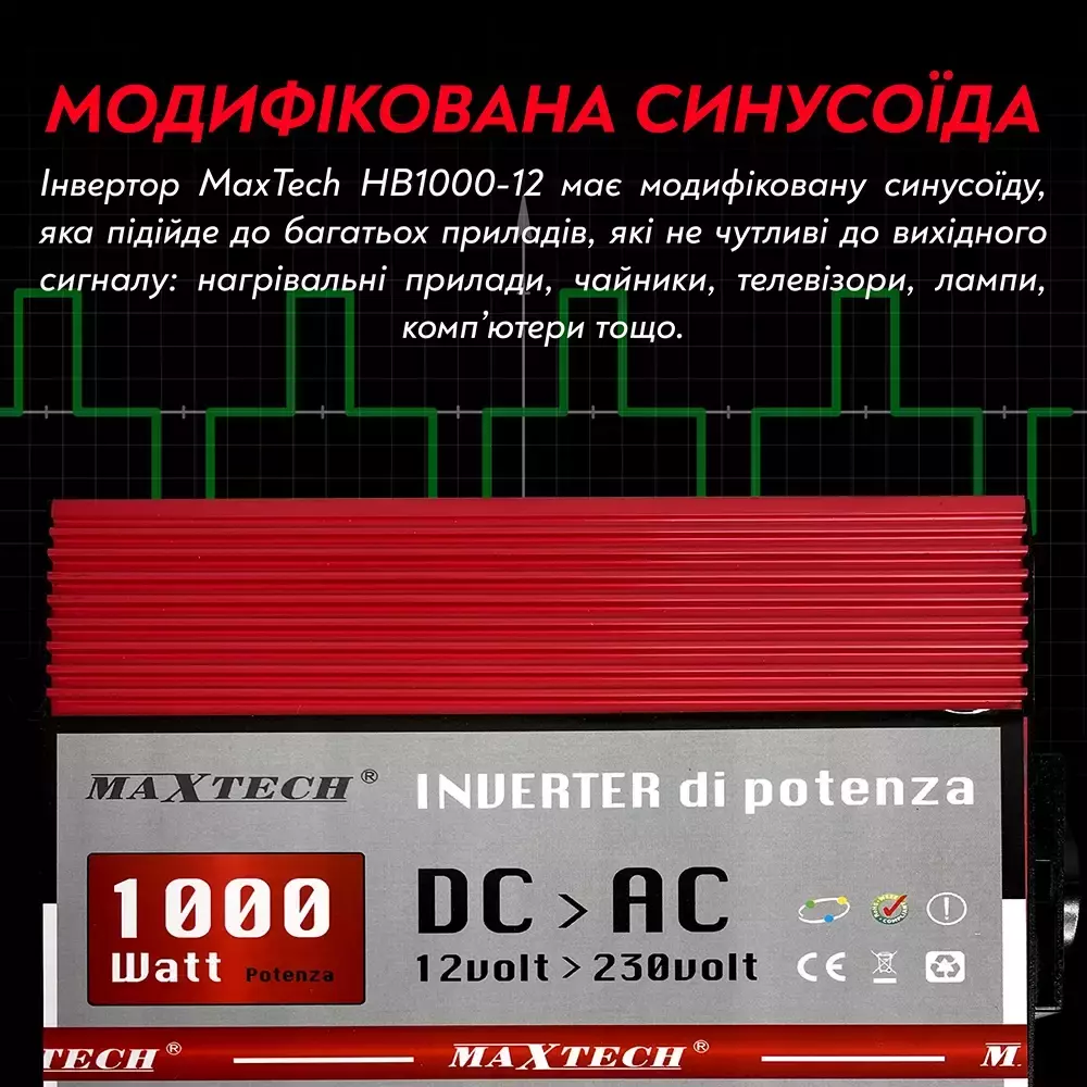 - Модифицированная синусоида. Инвертор MaxTech HB1000-12 имеет модифицированную синусоиду, которая подойдет ко многим приборам, не чувствительным к выходному сигналу: нагревательным приборам, чайникам, телевизорам, лампам, компьютерам и т.д.