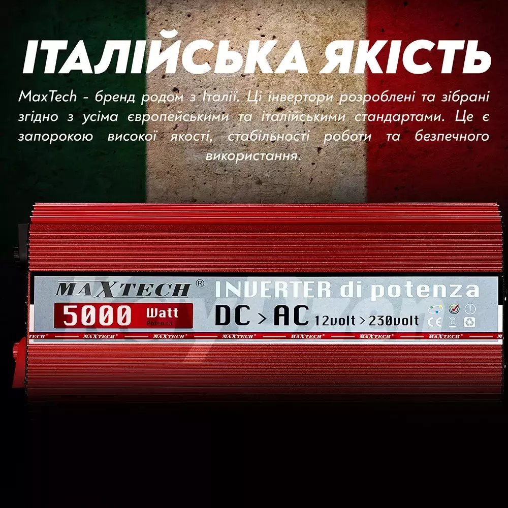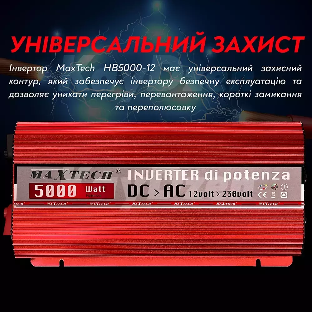 Преобразователь напряжения MaxTech HB5000-12 5000W продукт, который позволит Вам использовать в ситуациях и местах, где нет возможности подключения к сети 220 В, но есть возможность подключения и подключения к любому источнику питания 12 вольт (автомобильный аккумулятор, лодка, кемпер, солнечные батареи).