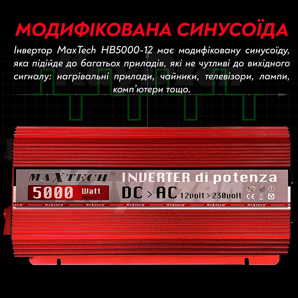 - Модифицированная синусоида. Инвертор MaxTech HB5000-12 имеет модифицированную синусоиду, которая подойдет ко многим приборам, не чувствительным к выходному сигналу: нагревательным приборам, чайникам, телевизорам, лампам, компьютерам и т.д.