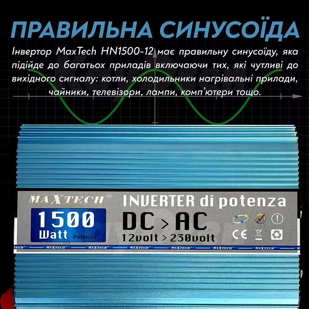 - Правильная синусоида. Инвертор MaxTech HN1500-12 имеет правильную синусоиду, которая имеет свойство допускать ошибки в приборах, включающих тихое, ядовито-чутливое соединение с нейтральным сигналом: котлы, холодильники нагревательные приборы, чайники, телевизоры, лампы, компьютеры и т.д.