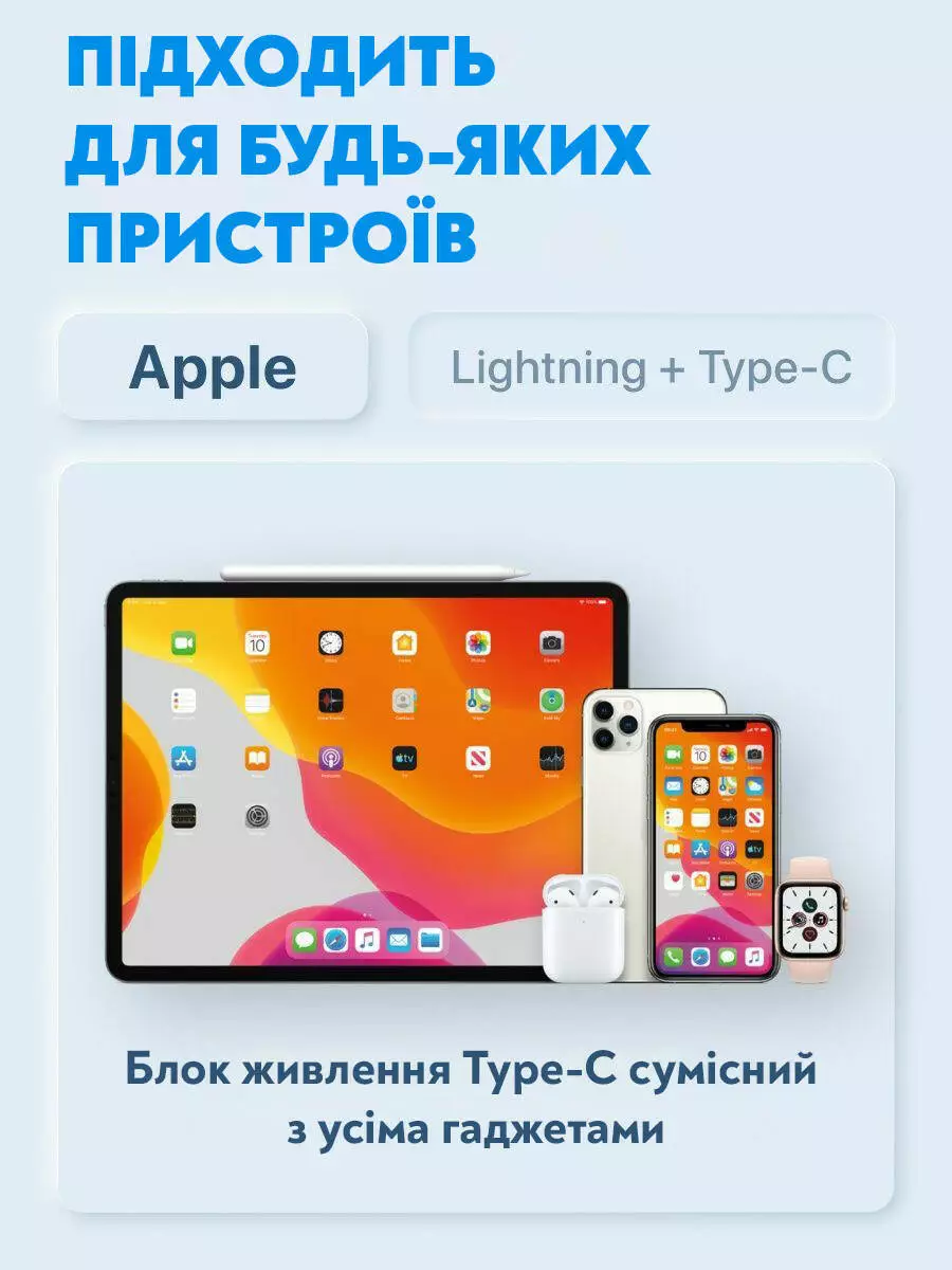 Сетевое зарядное устройство оснащено портом USB-C, который обеспечивает максимальную производительность и скорость зарядки. Благодаря технологии быстрой зарядки, ты сможешь быстро восстановить энергию своих устройств Apple и не терять времени на длительное ожидание.
