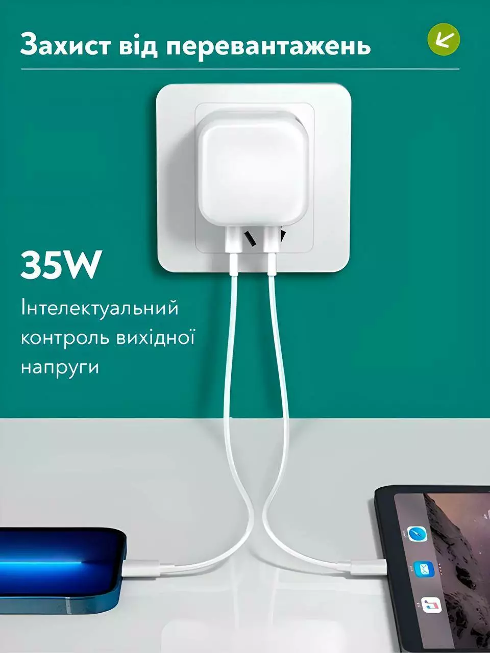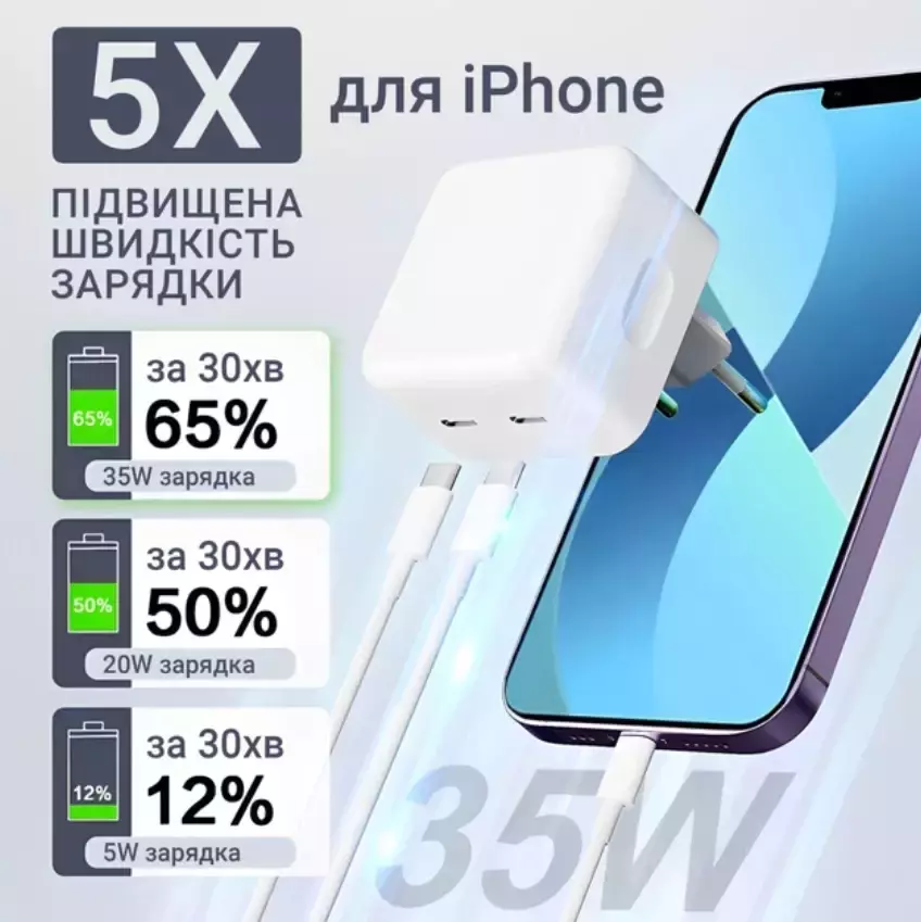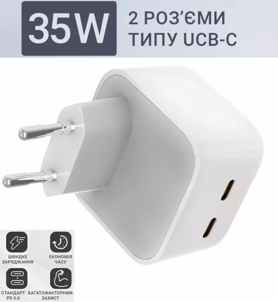 Сетевое зарядное устройство для Apple 35W с двумя портами USB-C - это надежное и мощное решение, которое дарит тебе комфорт и уверенность в зарядке твоих устройств Apple. Получи полный контроль над энергией своих устройств с этим компактным и мощным зарядным устройством.