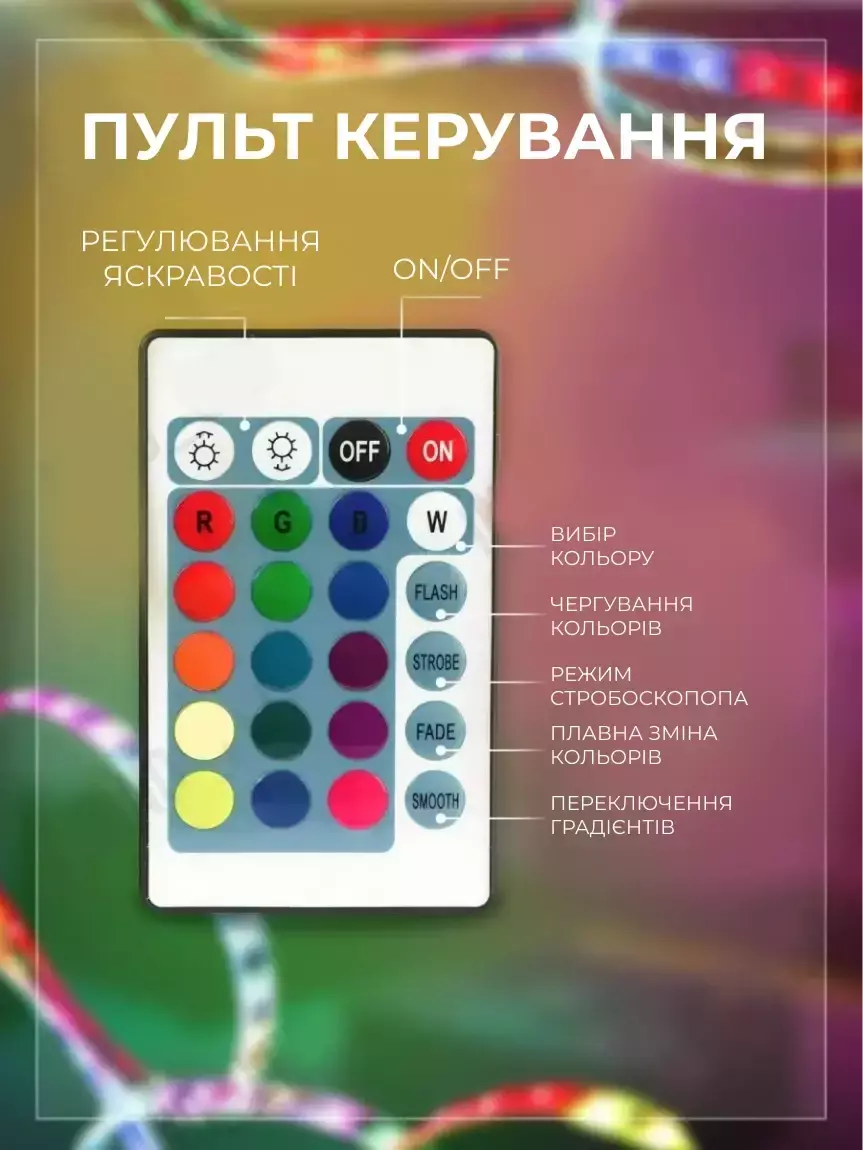 - Комплектация: Светодиодная лента, контроллер, пульт ДУ, блок питания, блистерная коробка