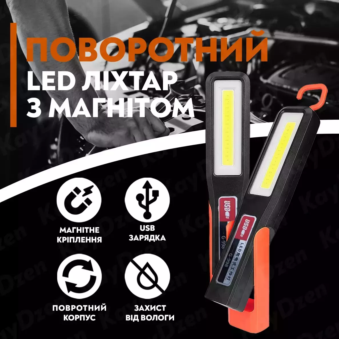 Светодиодный LED светильник Leovin ZMY-G998 может использоваться для различных ремонтных работ, в походах, в автомастерских, светильник имеет поворотный магнит и крючок, которые позволят Вам с легкостью установить его в любом удобном месте.
