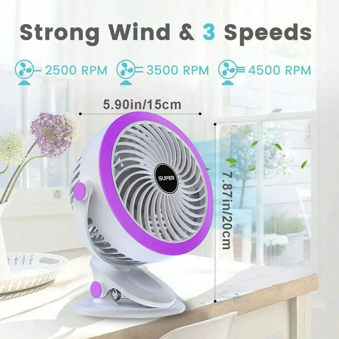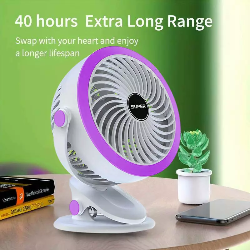 Тихий мощный usb мини вентилятор Andowl QF200 компактный с аккумулятором на прищепке (Фиолетовый)