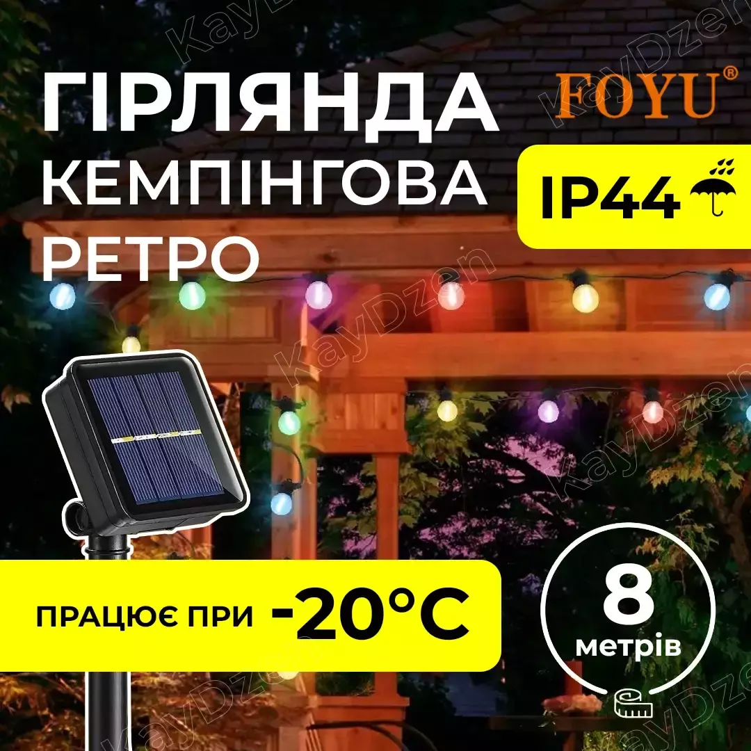 Уличная (кемпинговая) светодиодная ретро гирлянда итальянская LED FOYU Pm-0014 на солнечной батарее 8 метров