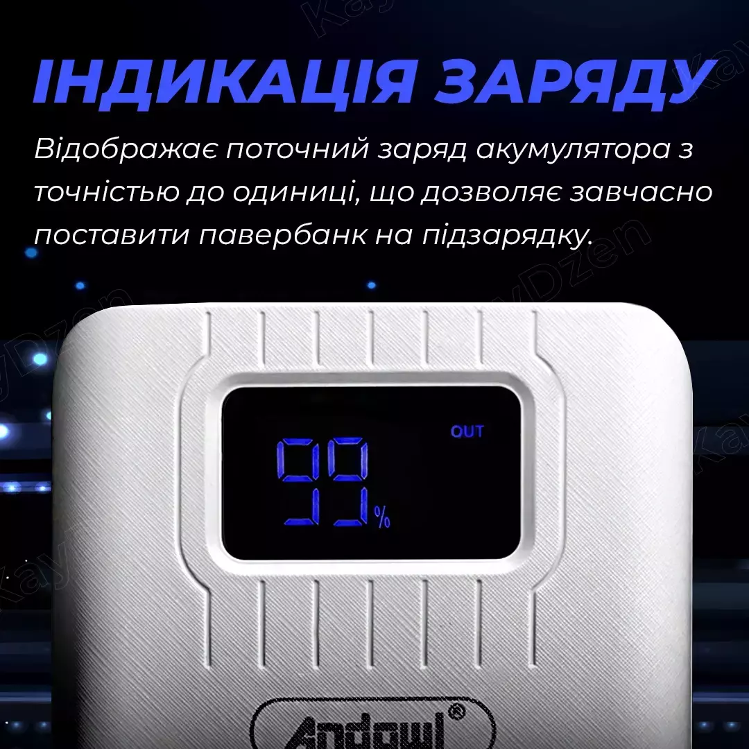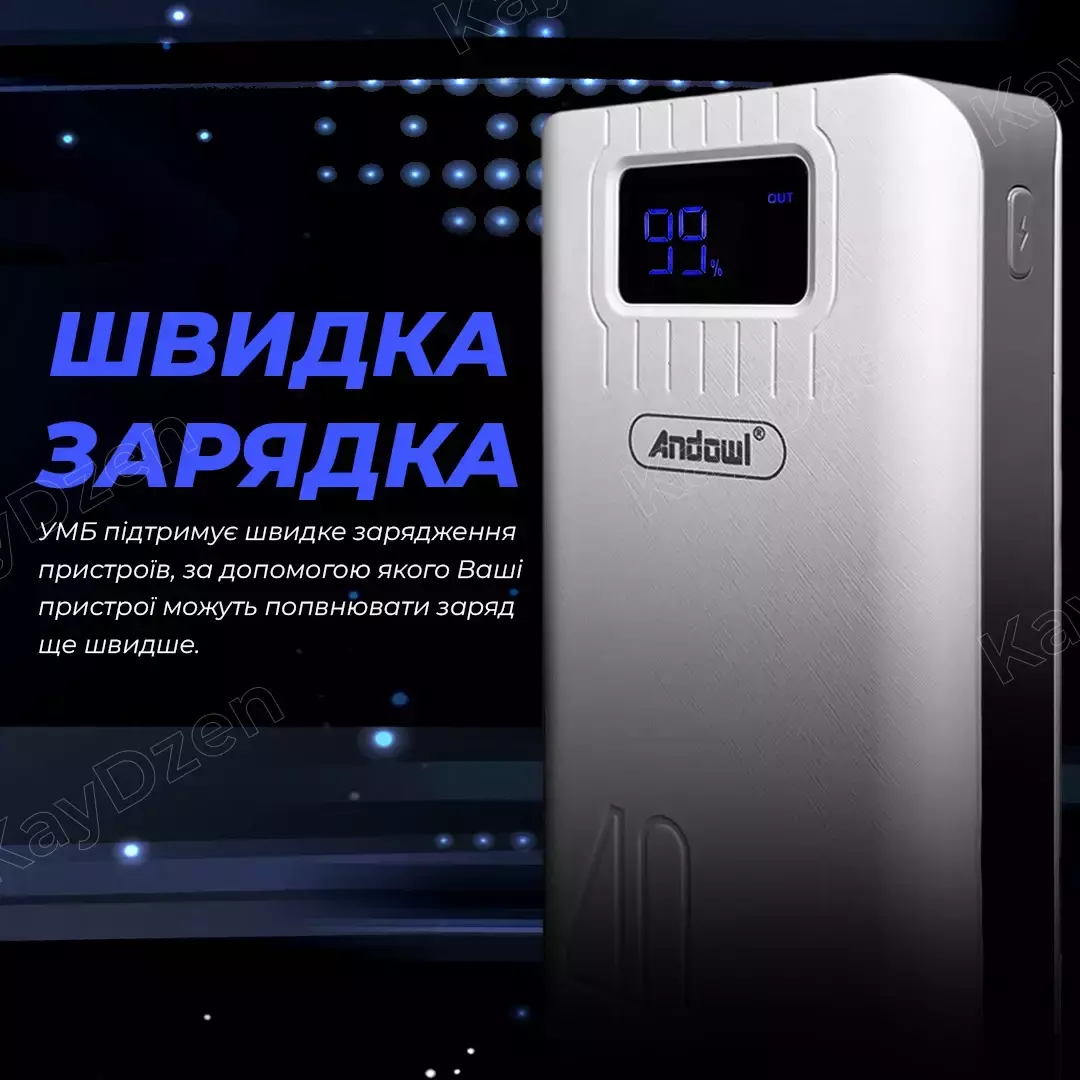 Внешний аккумулятор Power Bank Andowl Q-CD701 40000 mAh имеет быструю зарядку одновременно для телефонов и планшетов через два USB-порта. Выходной порт 5В/2А автоматически определяет ток зарядки устройства и изменяет скорость достижения самой быстрой зарядки. На поверхности аккумулятора установлен дисплей, и уровень заряда батареи можно легко и четко проверить. Нет риска разрядки аккумулятора, Вы всегда можете знать уровень заряда аккумулятора. Благодаря встроенной защите, этот аккумулятор может автоматически определять и изменять зарядный ток в соответствии с различными устройствами, чтобы защитить ваши устройства от чрезмерного тока, перегрева и перегрузки, без риска безопасности.