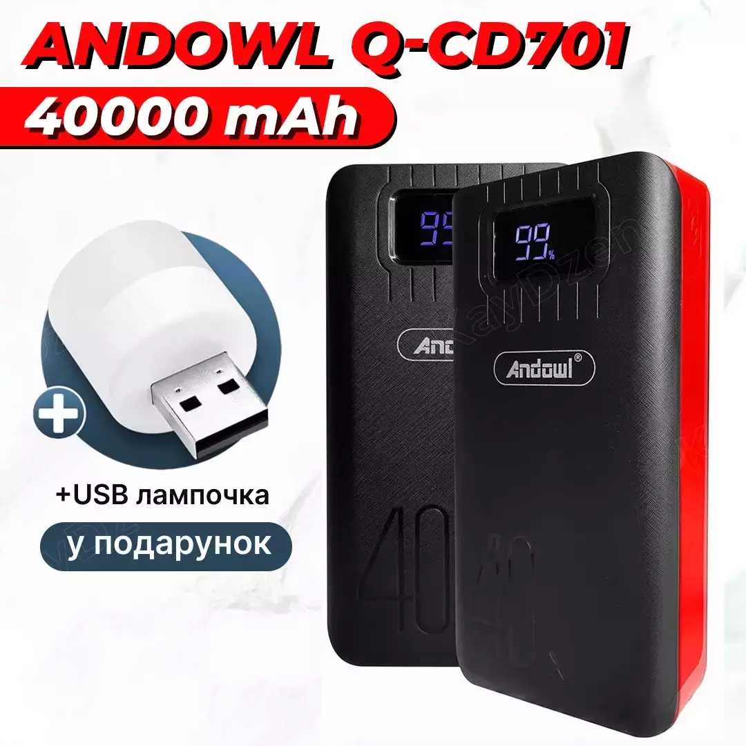 Power Bank Andowl Q-CD701 40000 mAh: высокоэффективный и мощный внешний аккумулятор, который обеспечит быструю и безопасную зарядку для ваших гаджетов. Этот повер банк оснащен двумя USB-портами для одновременной зарядки смартфонов и планшетов. С выходным портом 5В/2А, он автоматически адаптирует ток зарядки для достижения оптимальной скорости, обеспечивая максимально быструю и эффективную зарядку.