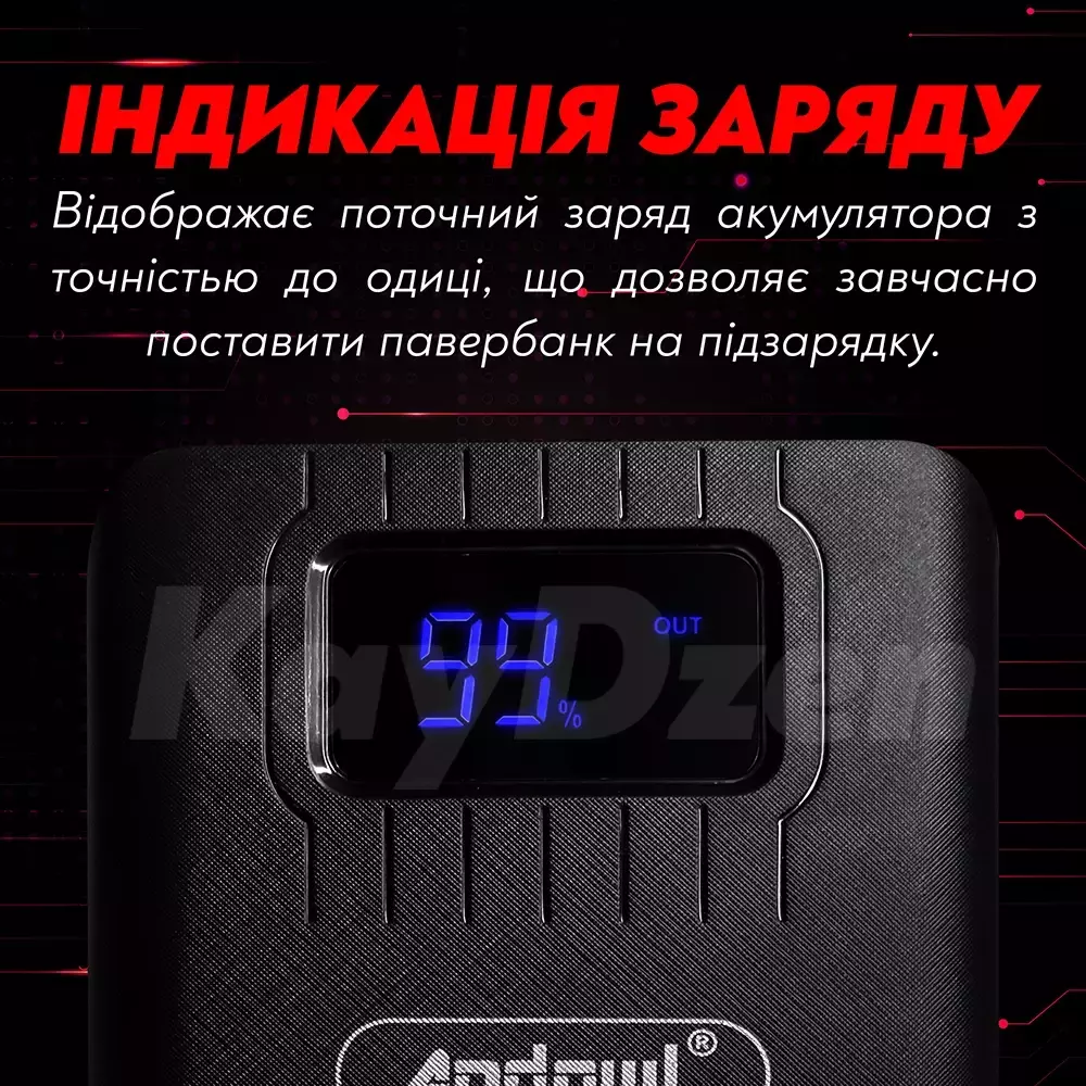 Дисплей на поверхности аккумулятора позволяет легко отслеживать уровень заряда, минимизируя риск внезапной разрядки. Встроенная система защиты интеллигентно определяет и регулирует ток зарядки в соответствии с подключенными устройствами, предотвращая перегрев, перегрузку и короткое замыкание.