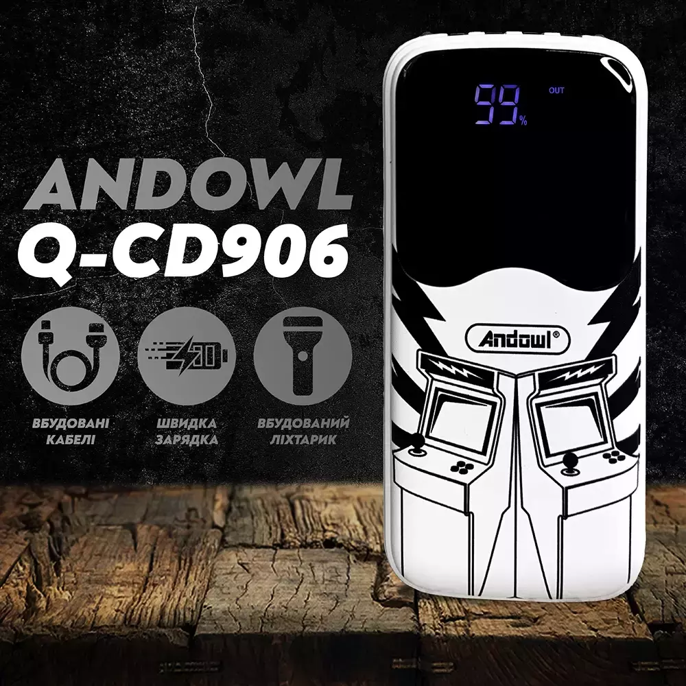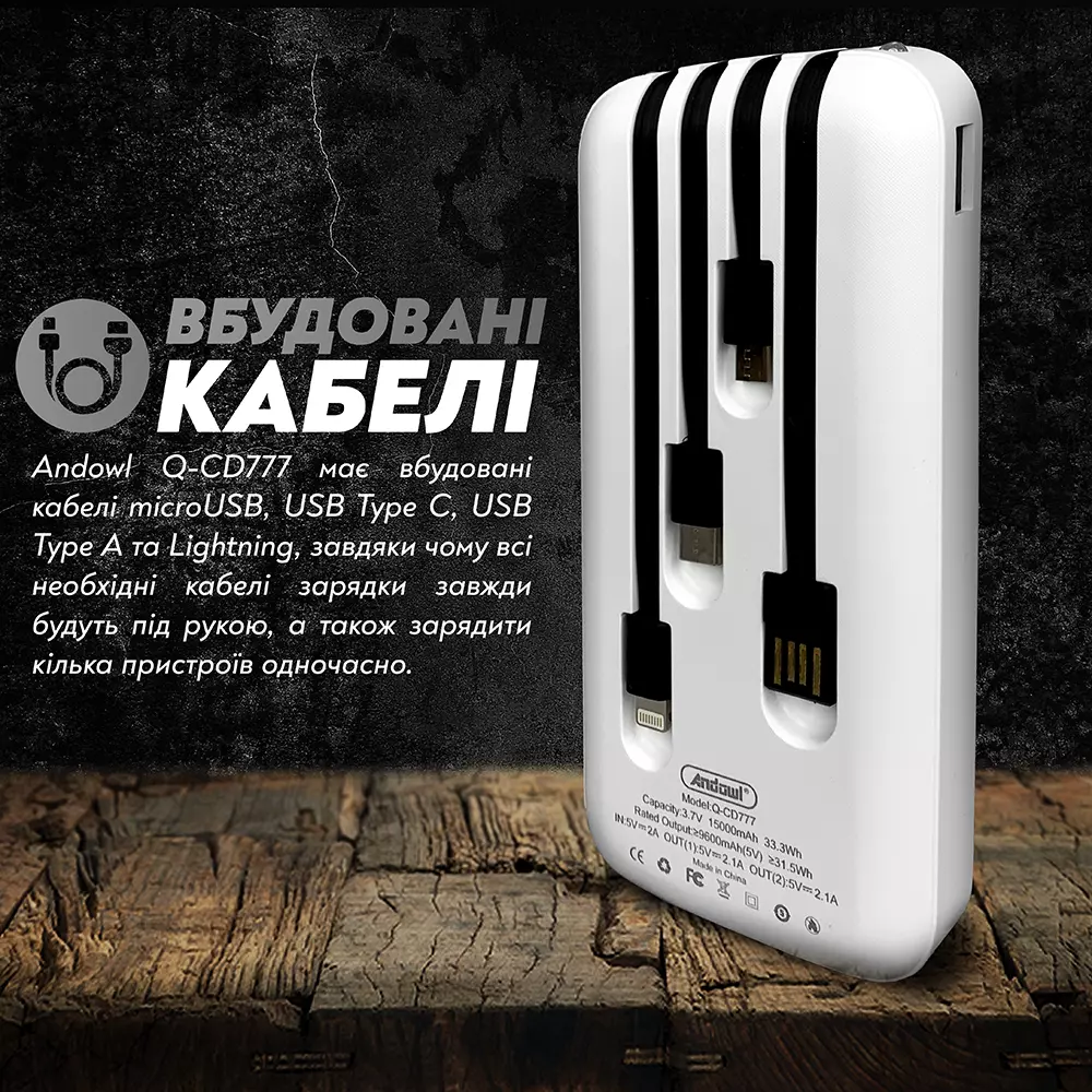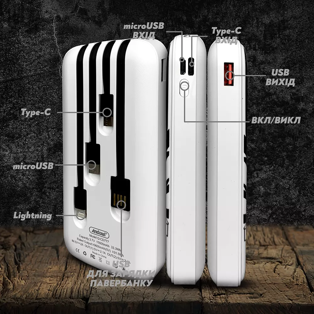 Универсальная мобильная батарея Andowl Q-CD777 емкостью 15000 mAh совместима со всеми современными смартфонами и планшетами. Благодаря индикатору уровня заряда, вы всегда будете знать, сколько энергии осталось в аккумуляторе. Также Andowl Q-CD777 имеет встроенные кабели USB, Type-C, Lightning и microUSB благодаря чему все необходимые кабели зарядки будут всегда под рукой. Больше не беспокойтесь о том, что пропустите важные звонки или уведомления. С павербанком Andowl всегда достаточно энергии для смартфона или другого мобильного устройства.