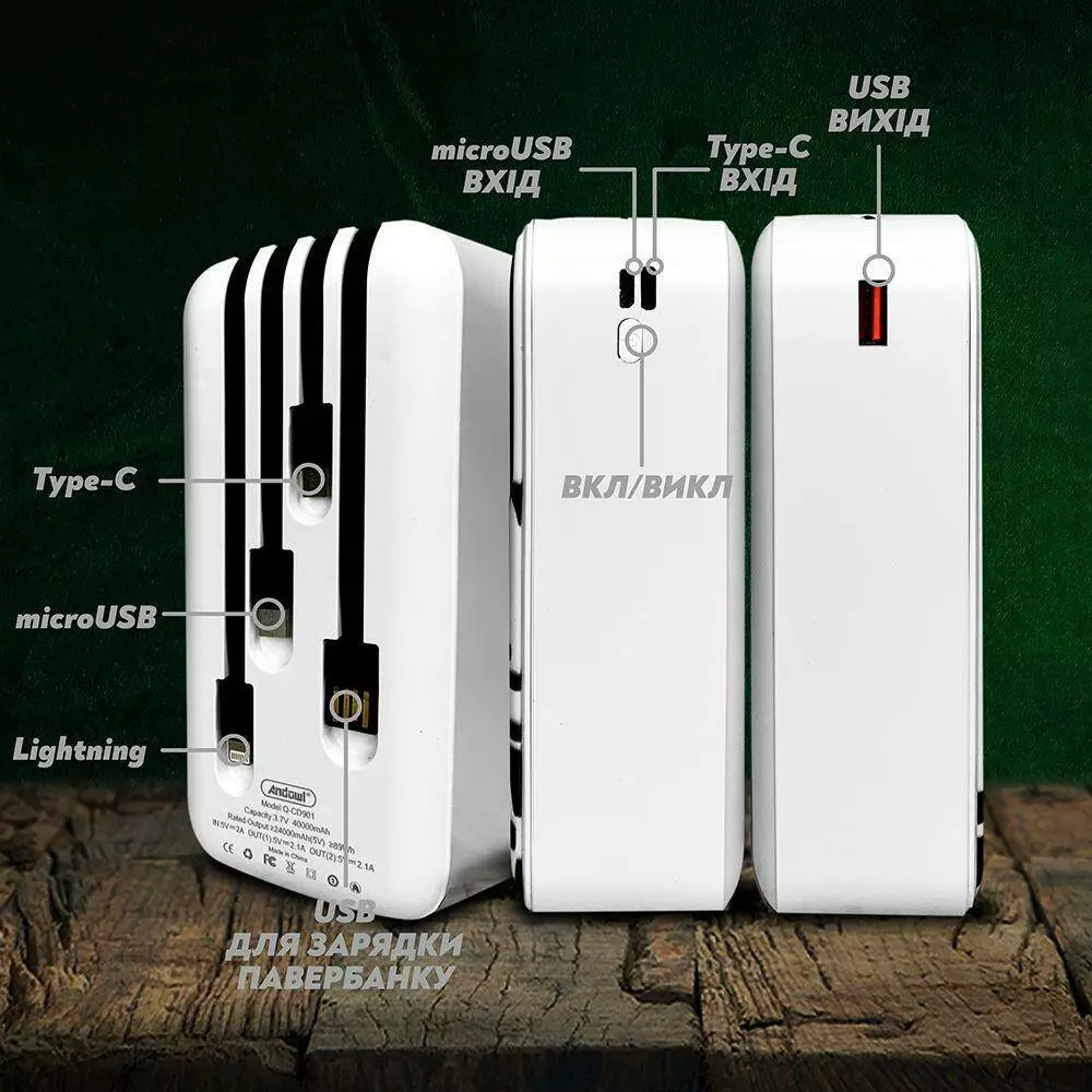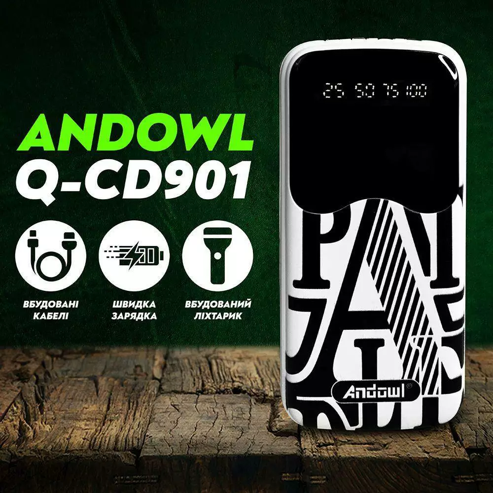 Портативная батарея Andowl Q-CD901 отличается стильным дизайном, высокой емкостью батареи и возможностью подключения нескольких устройств. Универсальная мобильная батарея Andowl Q-CD901 емкостью 40000 mAh совместима со всеми современными смартфонами и планшетами. Также УМБ Andowl Q-CD901 располагает наличием встроенных кабелей microUSB, USB Type C, USB Type A и Lightning с тыльной стороны устройства.