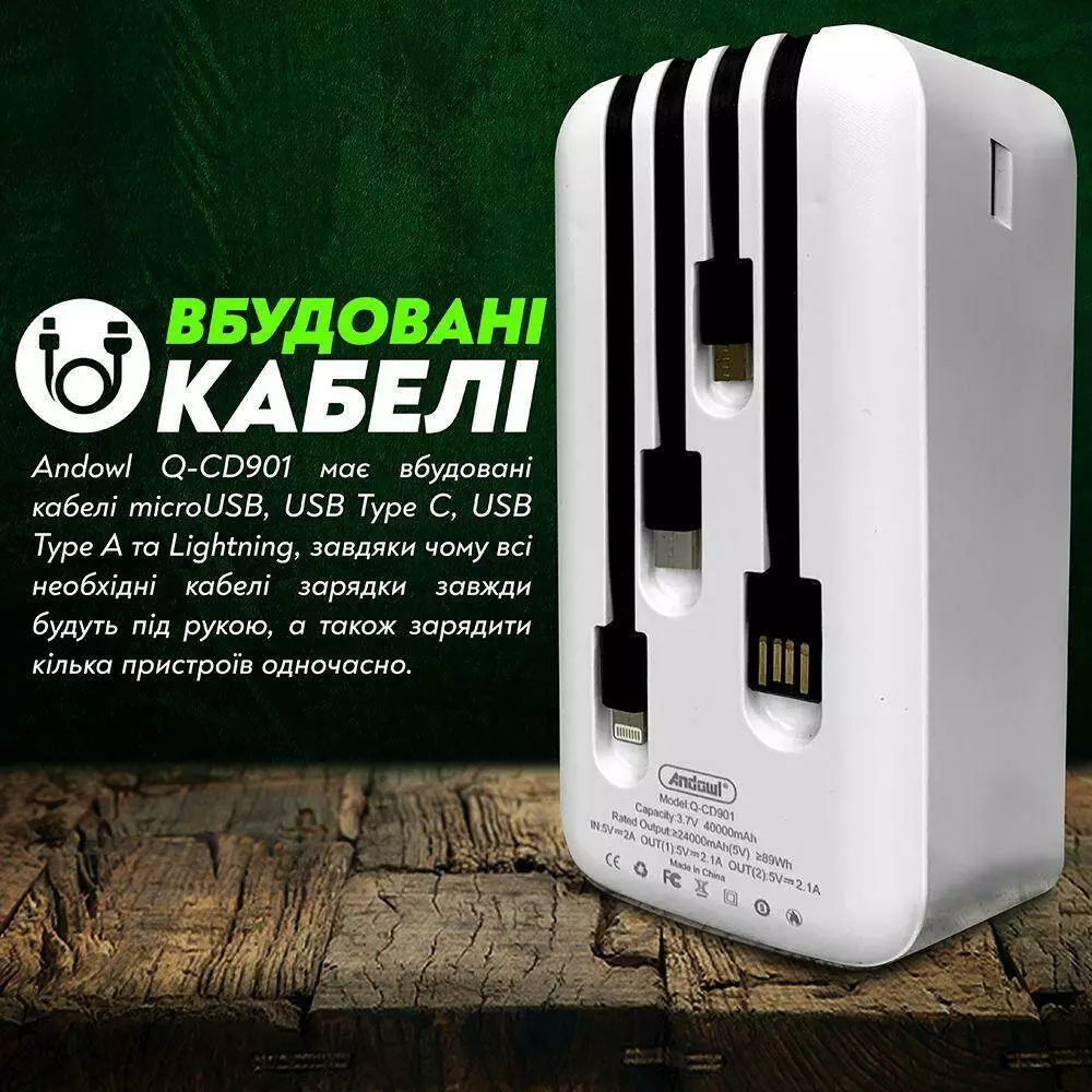 - Встроенные кабели. Andowl Q-CD901 имеет встроенные кабели microUSB, USB Type C, USB Type A и Lightning, благодаря чему все необходимые кабели зарядки будут всегда под рукой, а также зарядить несколько устройств одновременно.