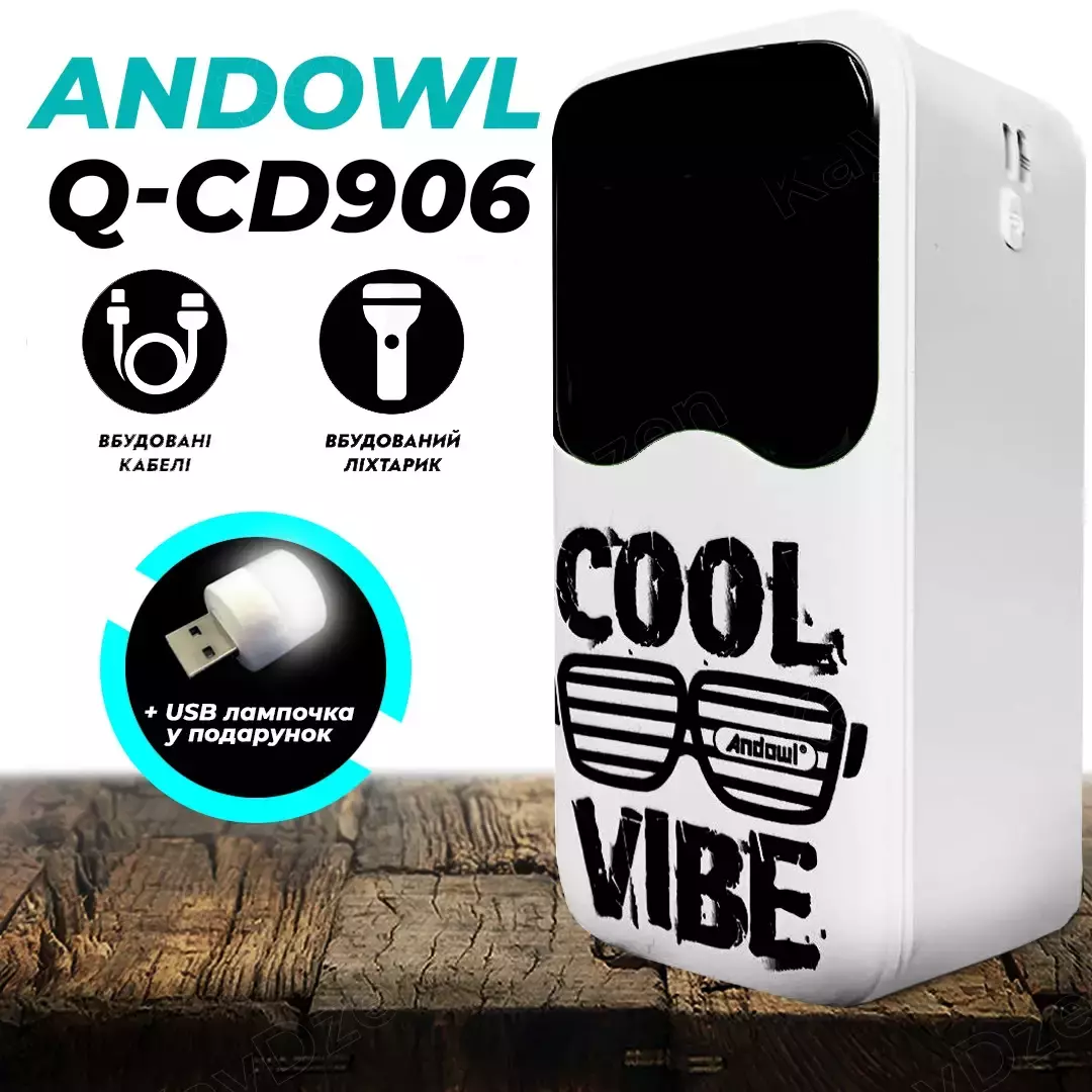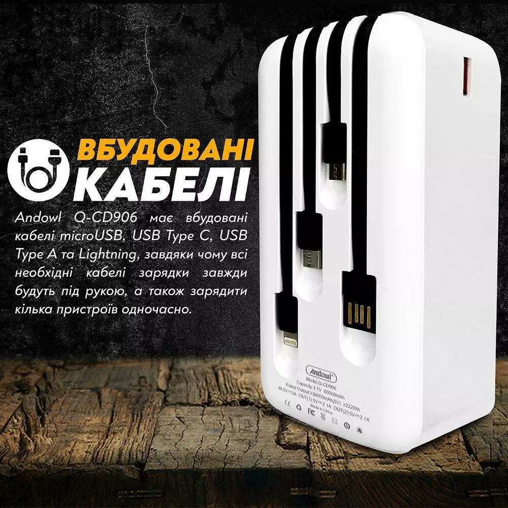 - Встроенные кабели. Andowl Q-CD906 имеет встроенные кабели microUSB, USB Type C, USB Type A и Lightning, благодаря чему все необходимые кабели зарядки будут всегда под рукой, а также зарядить несколько устройств одновременно.
