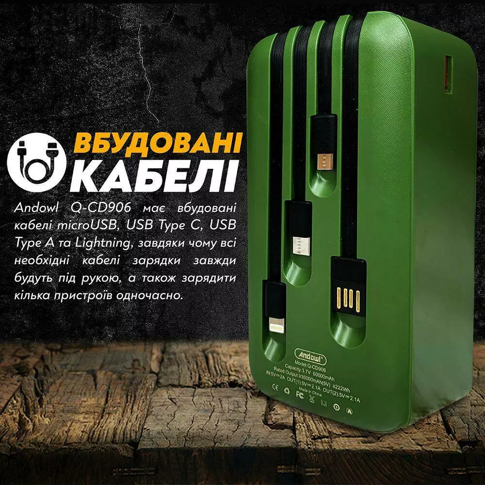 - Встроенные кабели. Andowl Q-CD906 имеет встроенные кабели microUSB, USB Type C, USB Type A и Lightning, благодаря чему все необходимые кабели зарядки будут всегда под рукой, а также зарядить несколько устройств одновременно.