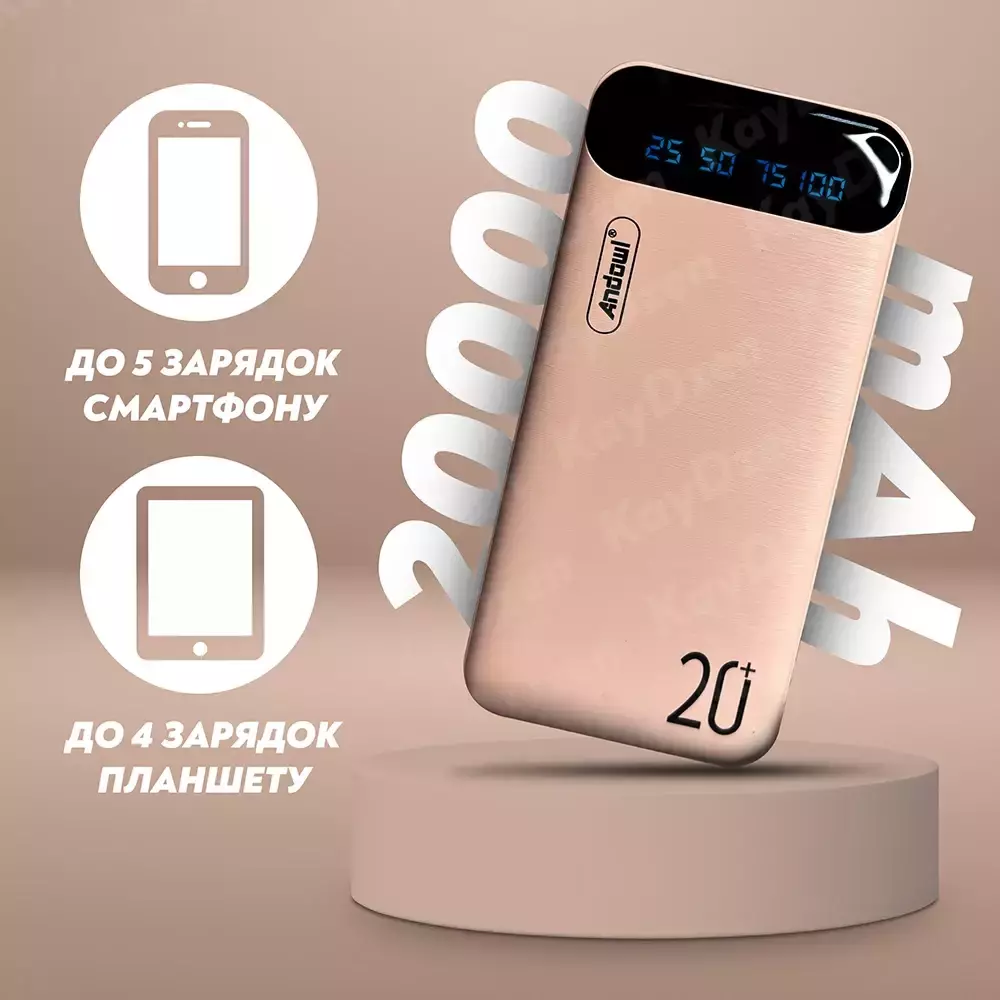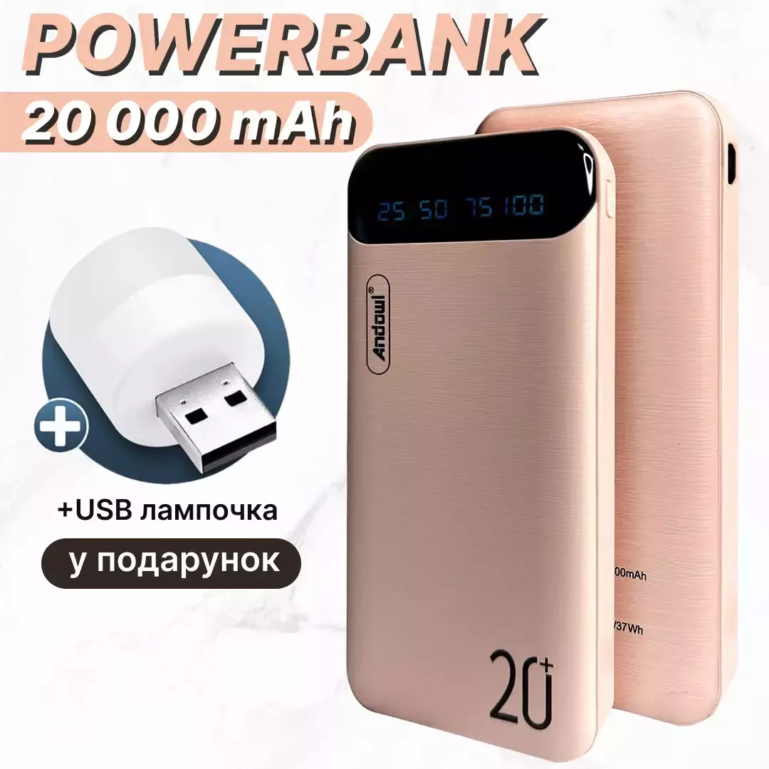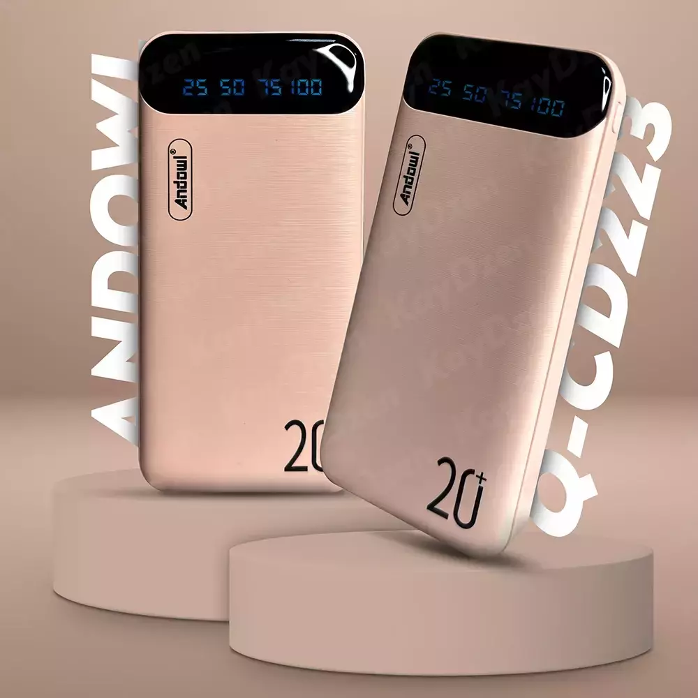 Power Bank Andowl Q-CD223 20000 mAh отличается стильным дизайном, высокой емкостью батареи и возможностью подключения нескольких устройств.