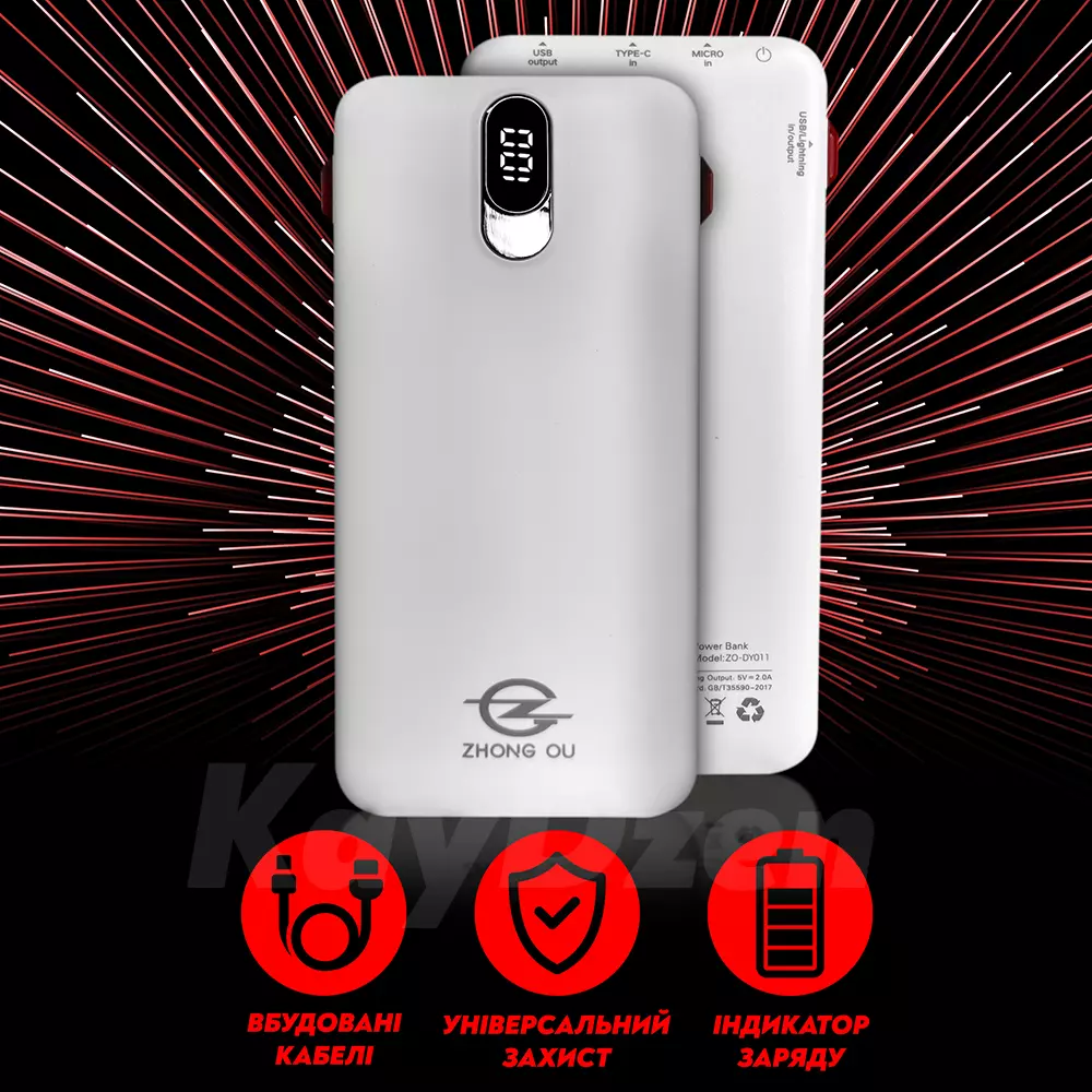 С Power Bank Zhong Ou ZO-DY011 20000 mAh вы можете быть уверены, что у вас будет столько энергии, сколько необходимо для поддержания работы ваших устройств. Имеет как Lightning, так и Type-C и MicroUSB выходы, благодаря этому нет внешний аккумулятор подходит для всех Ваших устройств. На поверхности аккумулятора установлен дисплей, и уровень заряда батареи можно легко и четко проверить. Нет риска разрядки аккумулятора, Вы всегда можете знать уровень заряда аккумулятора.