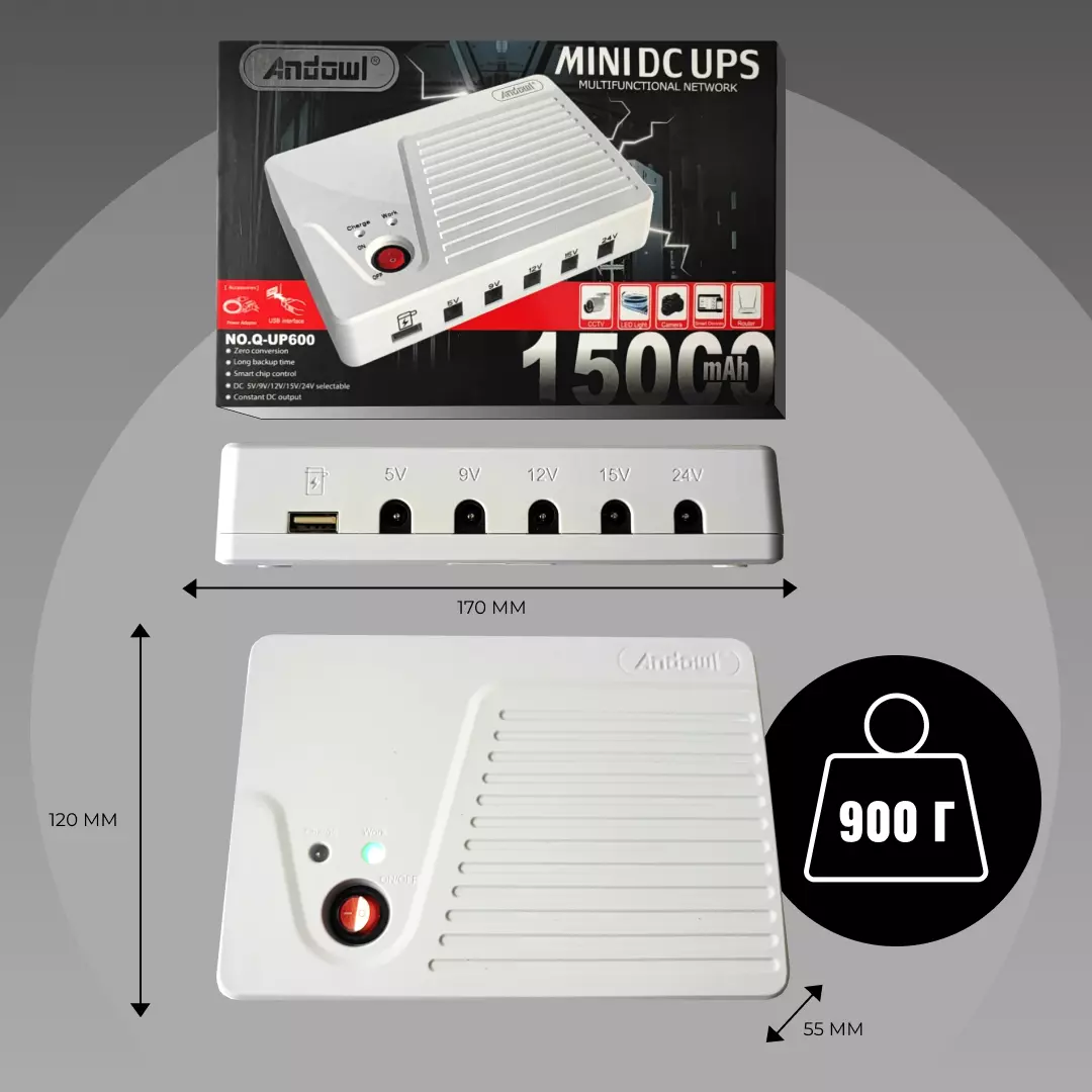 Andowl Q-UP600 MINI DC UPS 15000mAh — надежный источник бесперебойного питания (бесперебойник), который обеспечит ваши устройства энергией в случае перебоев с электроснабжением. Он идеально подходит для небольших цифровых устройств, таких как модемы, маршрутизаторы, IP-камеры и сетевые периферийные устройства.
