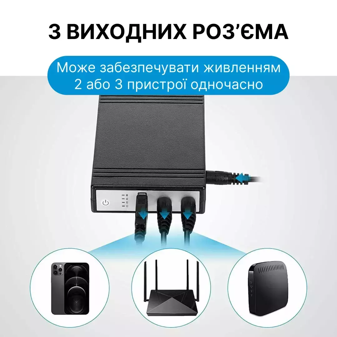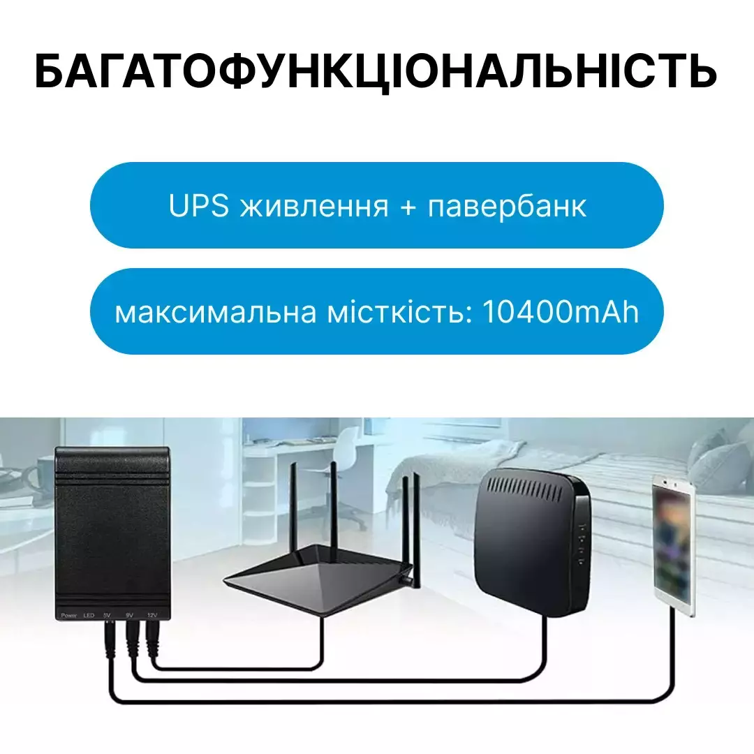 Мини UPS Модели WGP 103A-5912 10400mah — универсальное устройство, которое обеспечивает бесперебойное питание ваших электронных устройств. С мощным аккумулятором емкостью 10400mAh, он идеально подходит для питания Wi-Fi роутеров, модемов, телефонов и систем видеонаблюдения (CCTV) в случае перебоев с электроснабжением.