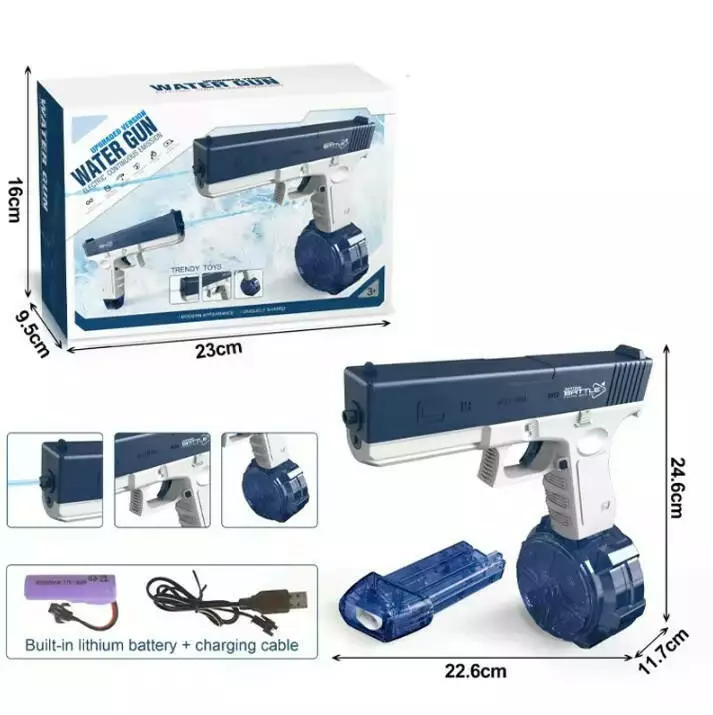 - Комплект поставки: Водяной пистолет – 1 шт;; Аккумулятор – 1 шт;; Кабель зарядки – 1 шт;; Бак для воды – 2 шт.