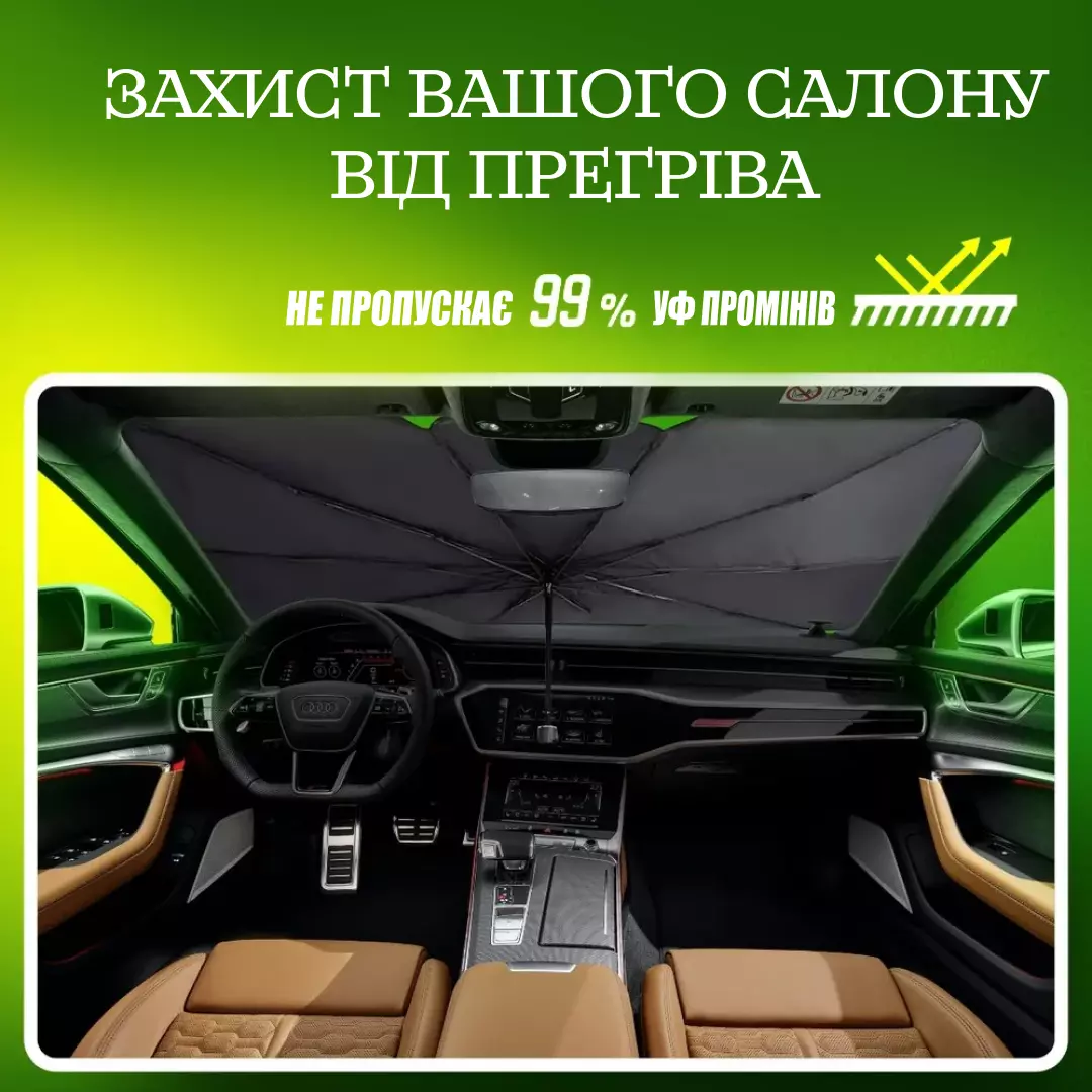 Солнцезащитный зонт, который обеспечивает надежную защиту вашего автомобиля от солнца и тепла, поддерживая комфортную температуру и предотвращает повреждения салона автомобиля.